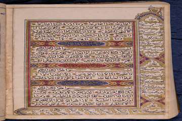 این مصحف رقم ندارد اما به سبک نسخه های ساخته و پرداخته شده در سالهای نخستین قرن چهاردهم هجری در شهر شیراز است. از تصاویری که پشت جلد کار شده و نیز از دو یادداشت تاریخ تولد به خط نصیرالملک مشخص می شود که نسخه برای او تهیه شده است. میرزا ابوالقاسم نصیرالملک شیرازی از اعیان شیراز بود و مناصب چندی در فارس داشت؛ از جمله پیشکاری حاکم فارس و نیابت ایالت فارس و وزارت فارس. در ربیع الاول 1311ق با درگذشت دایی و پدرزنش میرزا حسنعلی نصیرالملک (1237-1311ق) لقب نصیرالملک و تمامی ابواب جمعی اش به وی رسید. او در سال های 1319-1320ق. متولی باشی آستان قدس رضوی بود.1 تاریخ ساخت جلد این قرآن، ربیع الاول 1320ق، نشان می دهد نسخه در همین ایام ساخته یا به احتمالی کمتر فقط تجلید شده است. نصیرالملک در سال های اقامت در شیراز حامی فعالیت های هنری بود و علاقه وافری به تهیه نسخه های مزین و نفیس برای خود داشت. ازجمله محمدشفیع بن علی عسکر ارسنجانی در 1316ق به سفارش او صحیفه سجادیه ای تهیه کرد.2 یک سال بعد علی نقی بن میرزا یوسف مذهب باشی شیرازی نسخه ای از دیوان حافظ به خواستاری او نوشت.3 در جمادی الثانی همان سال علی اکبر بن میرزا عبدالله شیرازی نسخه ای از منشآت فرهاد میرزا برای او فراهم آورد.4 یک نسخه از زاد المعاد به خط عبدالله بن محمدحسین ارسنجانی مورخ صفر 1309ق نیز که برای او نوشته شده در همین دفتر معرفی خواهد شد. این مصحف هم با آنکه رقم ندارد اما به لحاظ ویژگی های سبکی و تزئینی و کتابتی محتمل است به یکی از افراد خاندان وصال شیرازی متعلق باشد. لذا نصیرالملک با افراد هر سه خاندان هنری و مهم شیراز در ابتدای قرن چهاردهم هجری در شیراز مرتبط بوده و به آنها سفارش کتابت و تذهیب و تجلید می داده است.
