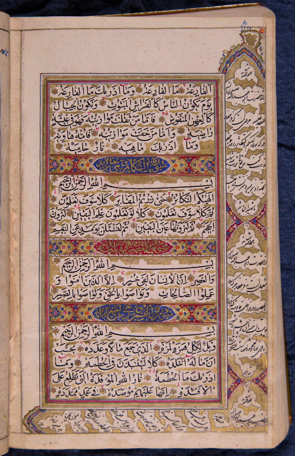 سرسوره ها همه درون کتیبه های مذهب و مرصع به زر نوشته شده است. رنگ زمینه کتیبه ها به ترتیب شنگرف و لاجوردی است. همه صفحات جدول کشی شده با طلای محرر و شنگرف و لاجورد و آبی و زنگار، کمند اندازی شده با طلای محرر. بین سطور در همه نسخه طلا اندازی شده. فواصل آیات گل های شش پر مذهب و مرصع. در گوشه بالایی همه برگ ها گل گوشه های مزین زمینه طلایی کشیده شده است. در گل گوشه های سمت راست حروف اختصاری استخاره آن صفحه و در سمت چپ نام سوره ها به قلم شنگرف رنگ نوشته شده است. علائم وقف و مدها به شنگرف. تقسیمات قرآن (شامل جزء و نصف جزء و حزب و سجده ها) درون شمسه های مذهب و مرصع زمینه لاجورد یا سرخ به زر نوشته شده است. خواص سور به خط شکسته نستعلیق با طلا اندازی بین سطور در حاشیه برگ ها نوشته شده است.