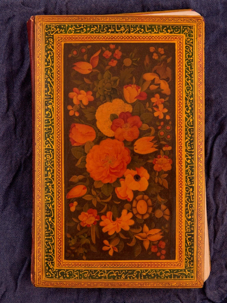 جلد روغنی نفیس. با گل و بوته های رنگین و مزین در وسط. در کتیبه دور تا دور آن حدیثی از پیامبر اسلام (ص) در توصیف قرآن و سوره یس نوشته شده است. تاریخ تحریر این کتیبه ربیع الاول 1320ق است. درون هر دو طبله جلد تصویر نصیرالملک همراه با نقش و نگارهای اسلیمی زرین در زمینه زرد و دور تا دور سرخ چسبانده شده است. اندازه جلد: 186*115.
