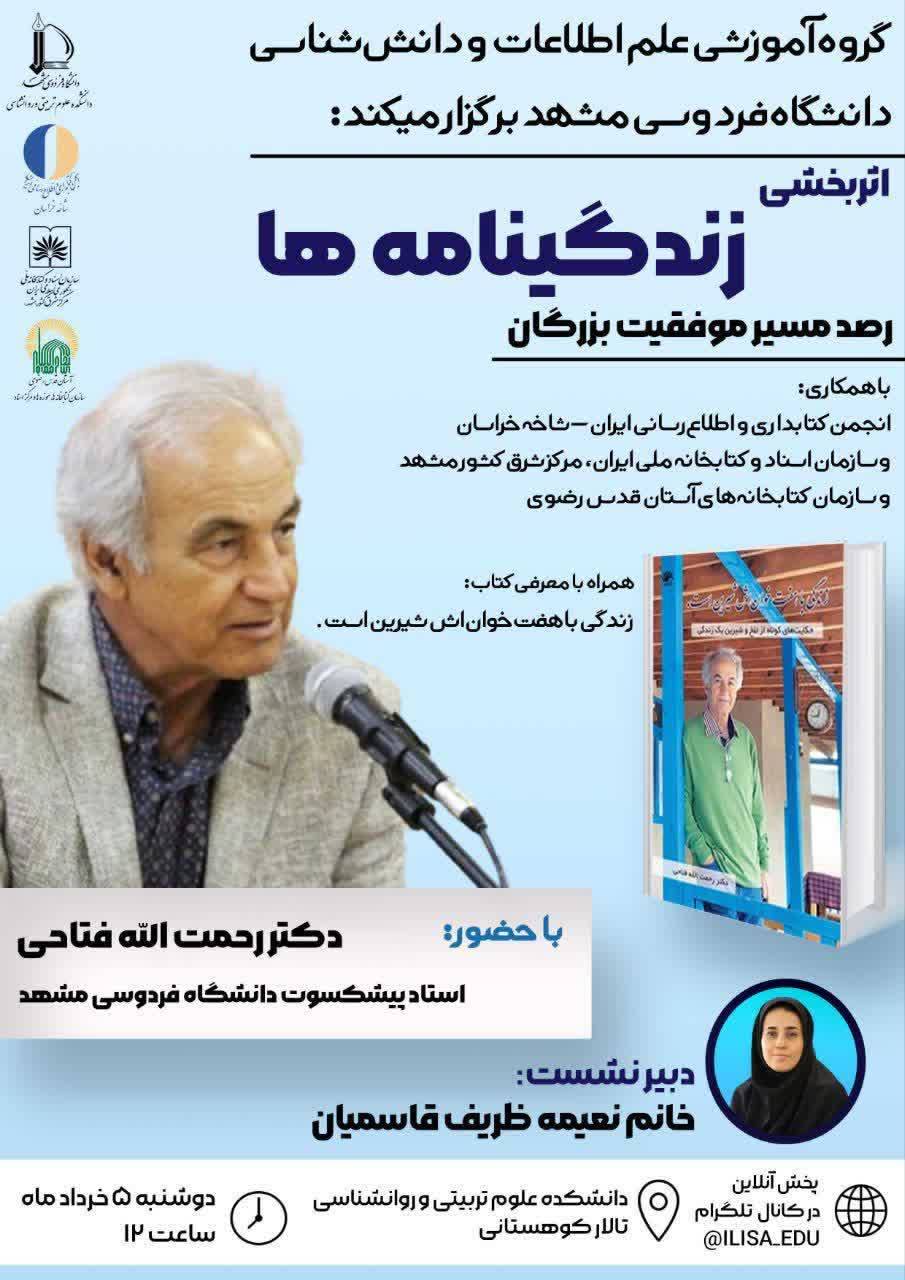نشست علمی «اثربخشی زندگینامهها: رصد مسیر موفقیت بزرگان» به همت گروه آموزشی علم اطلاعات و دانششناسی دانشگاه فردوسی مشهد با همکاری سازمان اسناد و کتابخانه ملی منطقه شرق کشور مشهد، انجمن کتابداری و اطلاع رسانی ایران شاخه خراسان و سازمان کتابخانه ها، موزه ها و مرکز اسناد آستان قدس رضوی و با حضور استادان، دانشجویان و متخصصان حوزه علم اطلاعات و دانششناسی در دانشگاه فردوسی مشهد برگزار شد.