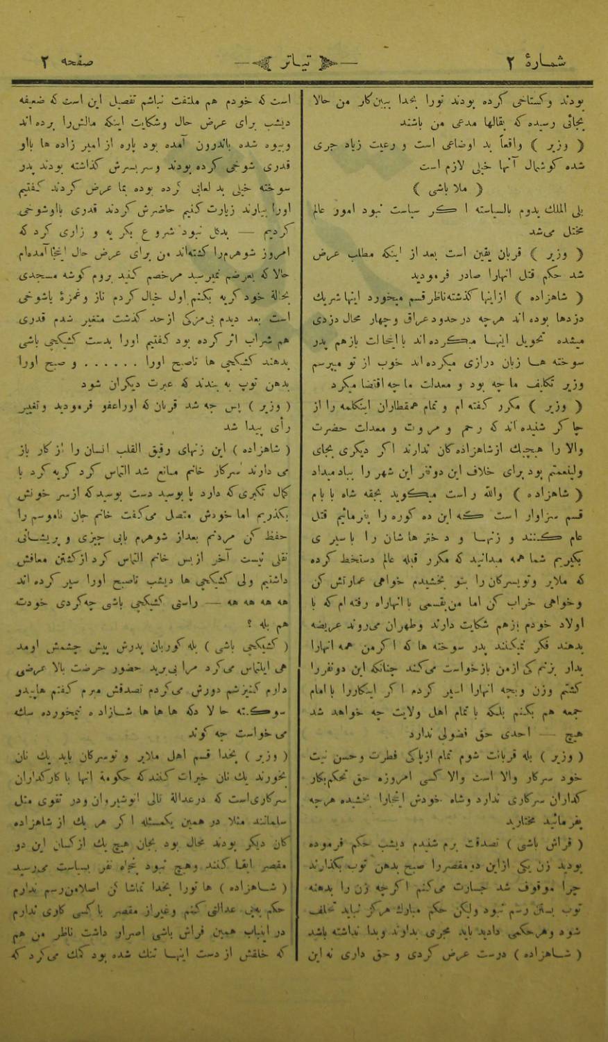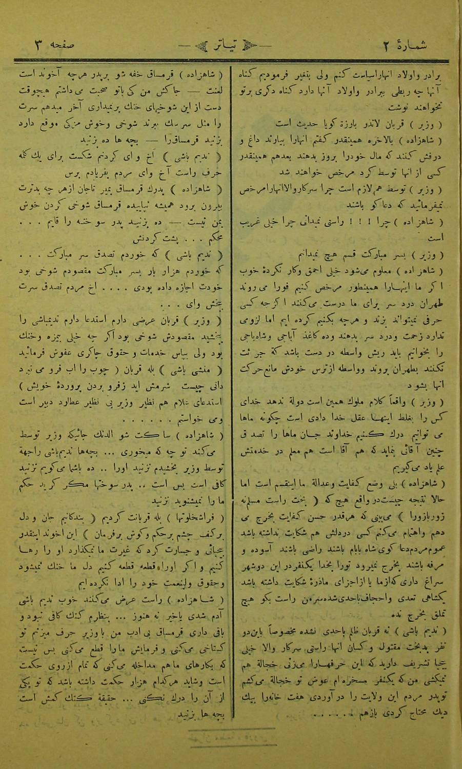 از جمله معروفترین نمایشنامههای منتشر شده در این مجله میتوان به نمایشنامه «شیخ علیخان حاکم ملایر و تویسرکان و عروسی با دختر شاه پریان» اشاره کرد که در ۷ پرده تنظیم شده است. این نمایشنامه در حقیقت به بیان مظالم و فساد حکام و عمال دولتی میپردازد.