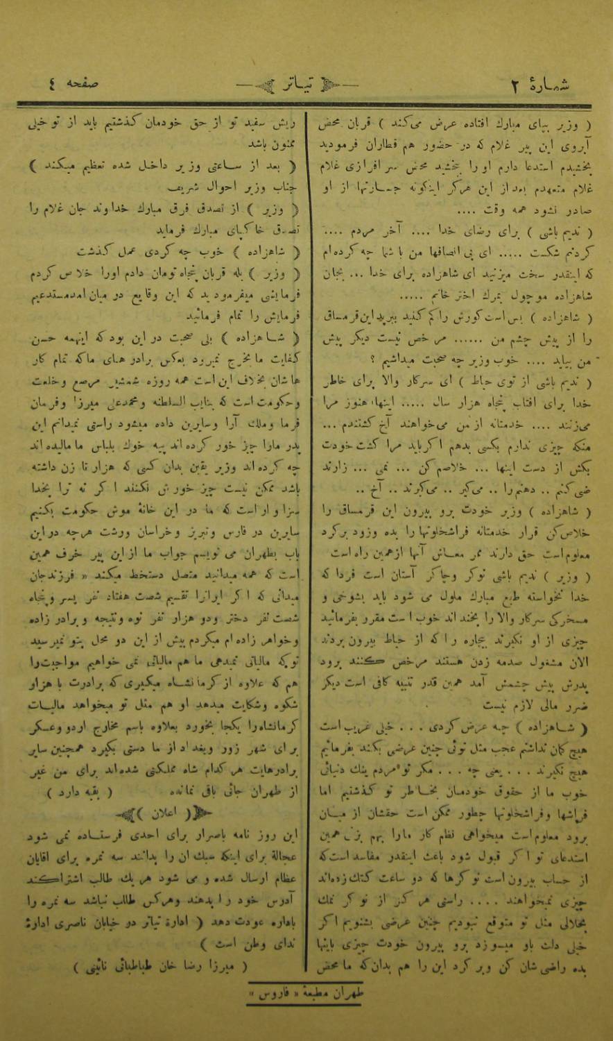 صاحبامتیاز روزنامه، سه اصل ترقی تمدن را «مدرسه»، «روزنامه» و «تئاتر» میداند و تئاتر را تجسم اعمال نیک و بد به منظور پند گرفتن تماشاگران از اعمال بد و گرایش به اعمال نیک بیان میکند.