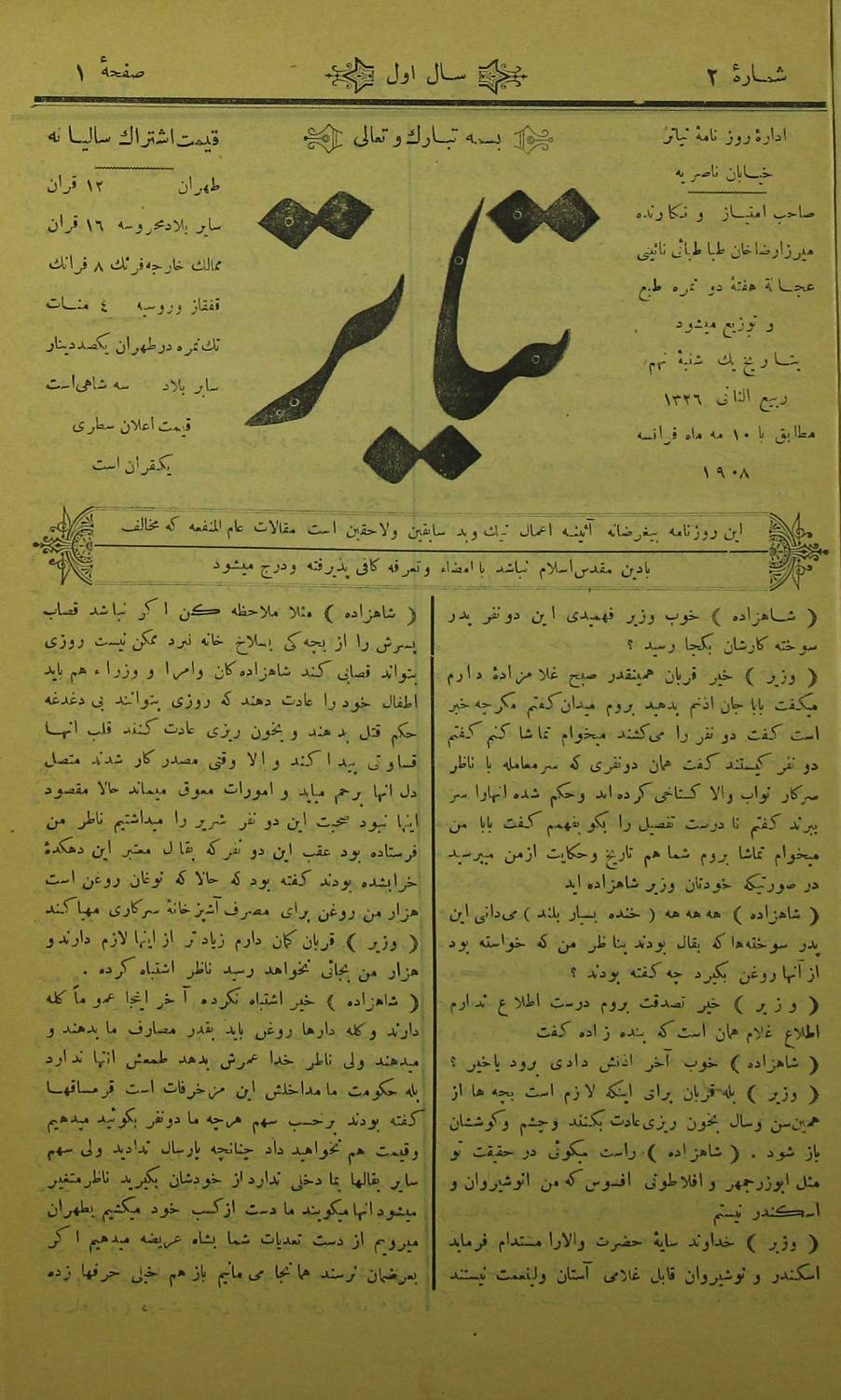 به گزارش روابطعمومی سازمان اسناد و کتابخانه ملی ایران، روزنامه «تیاتر» به عنوان اولین نشریه تئاتر ایران به صاحبامتیازی میرزا رضاخان نائینی در کشاکش انقلاب مشروطه در تاریخ ۴ ربیعالاول ۱۳۲۶قمری برابر با مه ۱۹۰۸ میلادی در «مطبعه فاروس» به صورت دو روز در هفته و در ۴ صفحه به قطع ۷ در ۱۱ سانتیمتر منتشر شد.