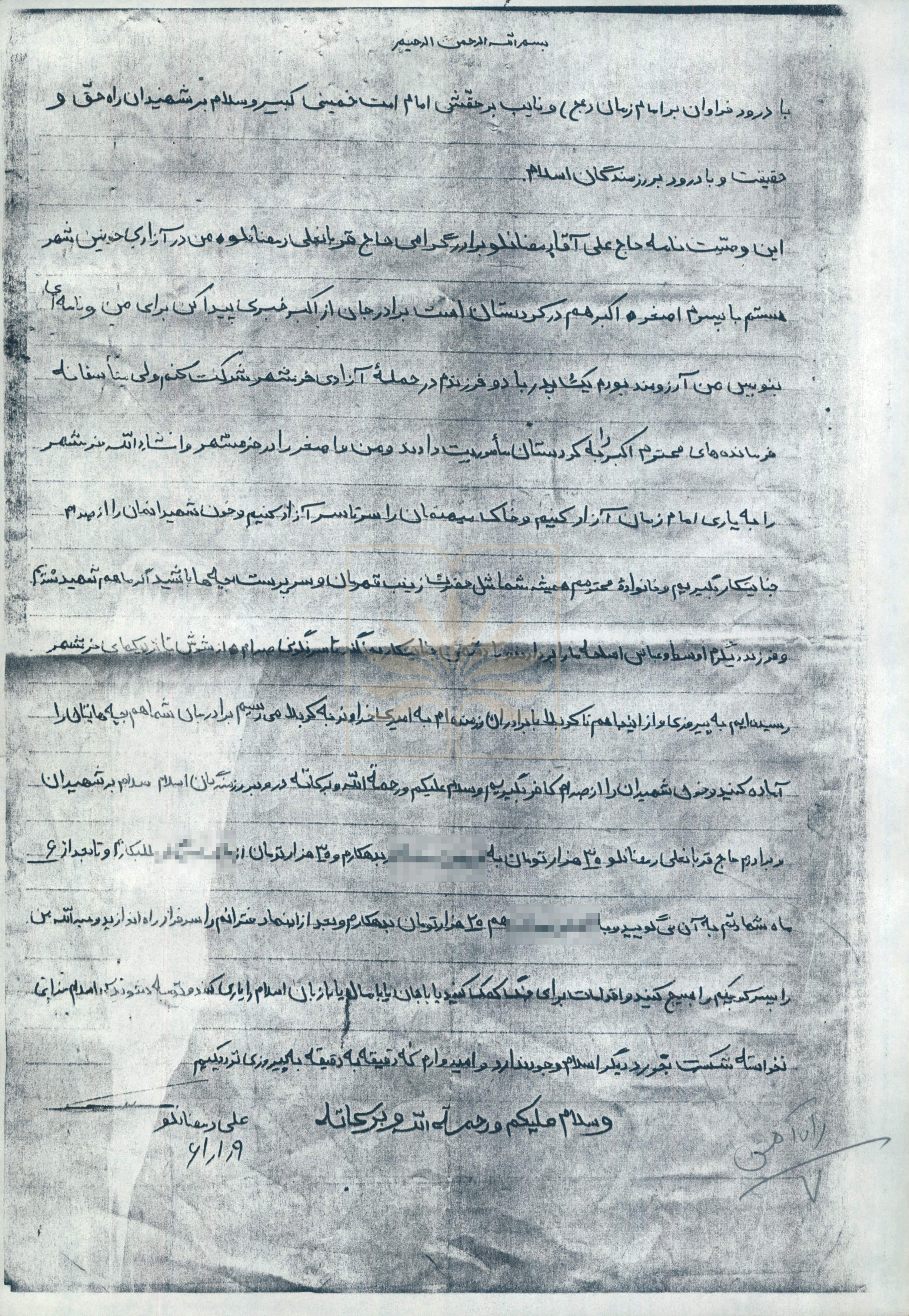 سند این شماره متعلق به شهید حاج علی رمضانلو، فرزند عوضعلی و متولد پنجم اسفند ۱۳۱۴ در زرندیه است. او وصیتنامه خود را در بحبوحه نبردهای منتهی به آزادسازی خرمشهر و در قالب نامهای خطاب به برادرش، حاج قربانعلی رمضانلو نوشته است. متن وصیتنامه، تصویری روشن از روحیه استوار او ارائه میدهد؛ پدری رزمنده که حضور دو فرزندش در عملیات آزادسازی خرمشهر را آرزویی دیرینه میداند و خانواده خود را به صبر، استقامت و تداوم راه جهاد توصیه میکند.