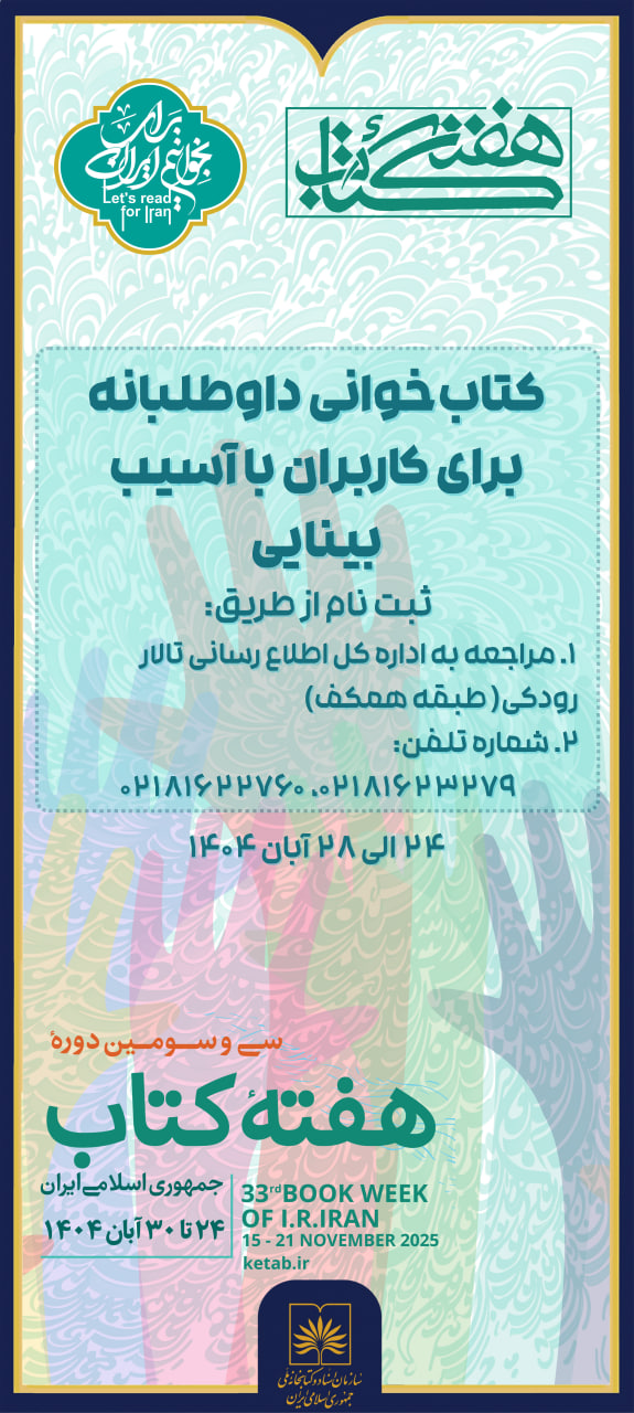 طرح «خدمت داوطلبانه خواندن کتاب برای کاربران با آسیب بینایی» با هدف گسترش خدمات فرهنگی و ترویج مشارکت اجتماعی اعضا، از ۲۴ تا ۲۸ آبانماه ۱۴۰۴ در سازمان اسناد و کتابخانه ملی ایران اجرا میشود.