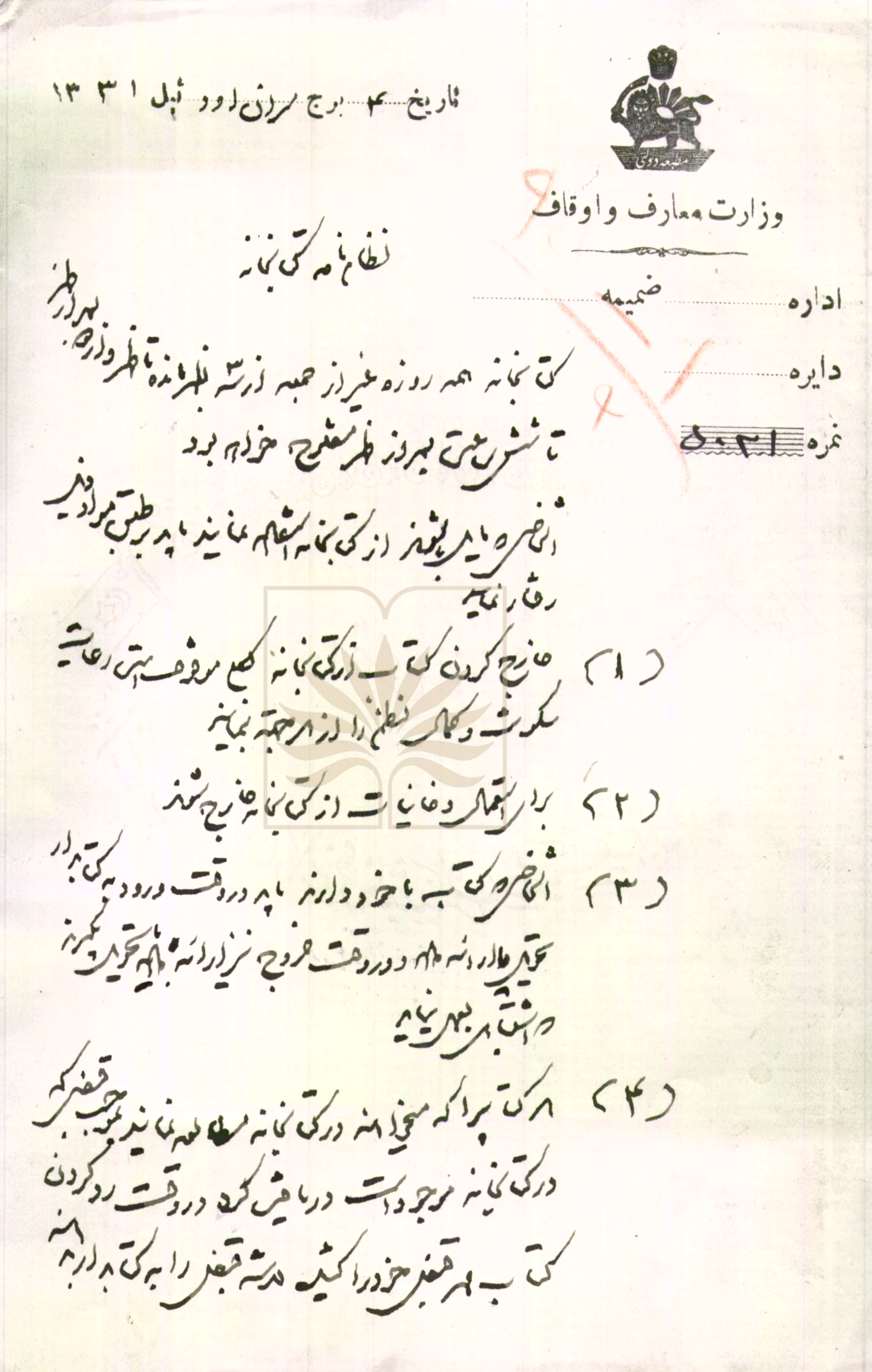سند این شماره با عنوان «نظام‌نامۀ کتابخانه در دورۀ قاجار» در تاریخ ۱۳۳۱ قمری / ۱۲۹۲ خورشیدی تنظیم شده و به وزارت معارف و اوقاف در سال‌های نخست پادشاهی احمدشاه تعلق دارد. این متن نشان می‌دهد که چگونه نهادهای اداری آن دوره می‌کوشیدند ساختار و نظم تازه‌ای برای خدمات کتابخانه‌ای و شیوه بهره‌گیری عمومی از کتابخانه‌ها ایجاد کنند.