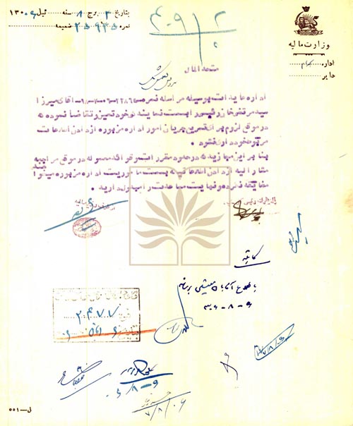 اين سند بخشنامهای از طرف وزیر مالیه است که در آن نماینده اداره عایدات برای دریافت اطلاعات مورد نیاز معرفی شده است.
