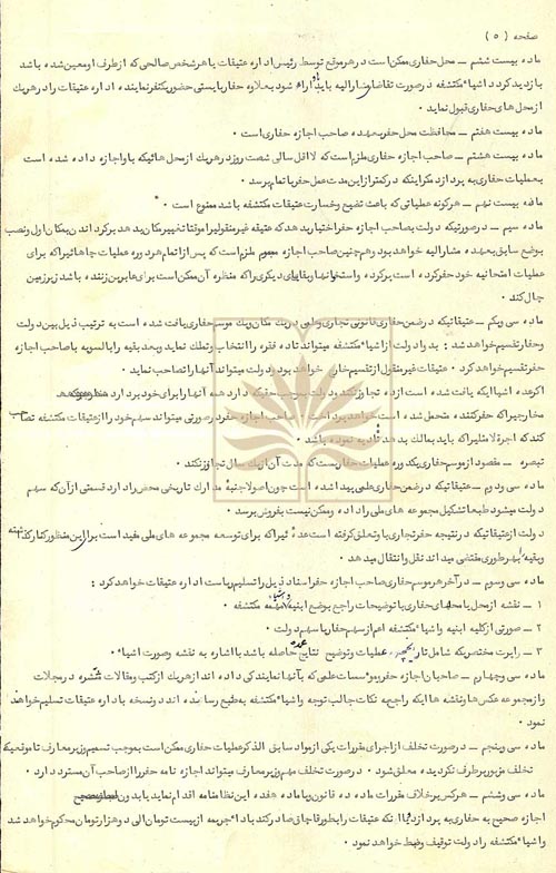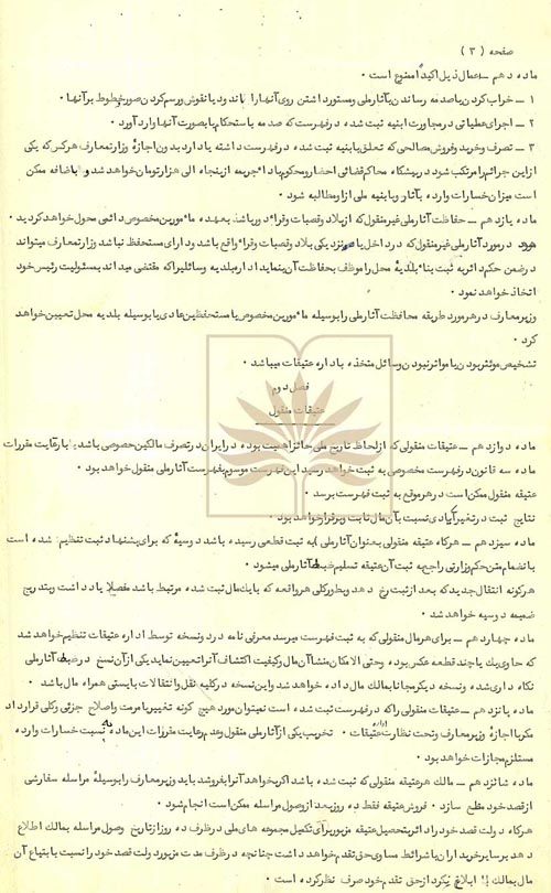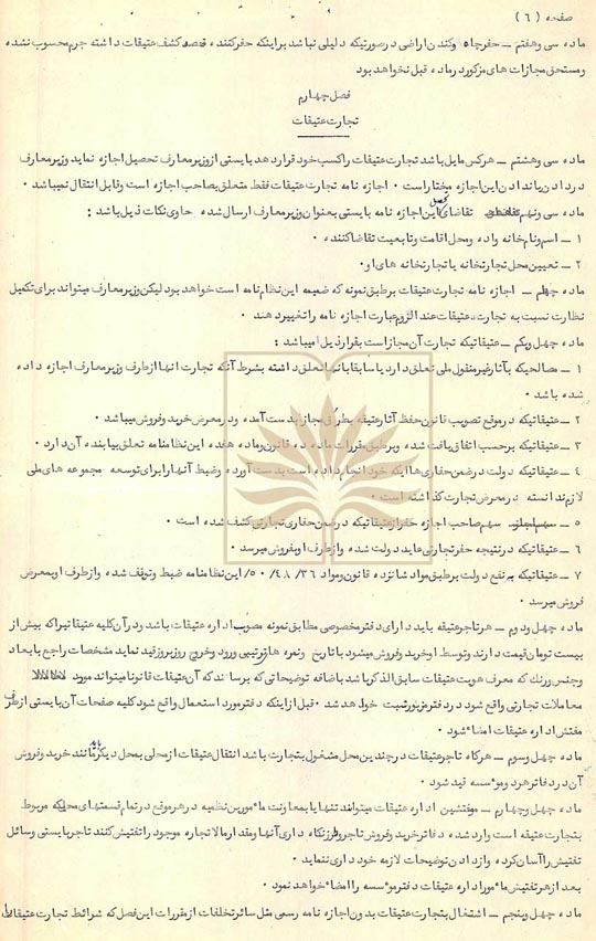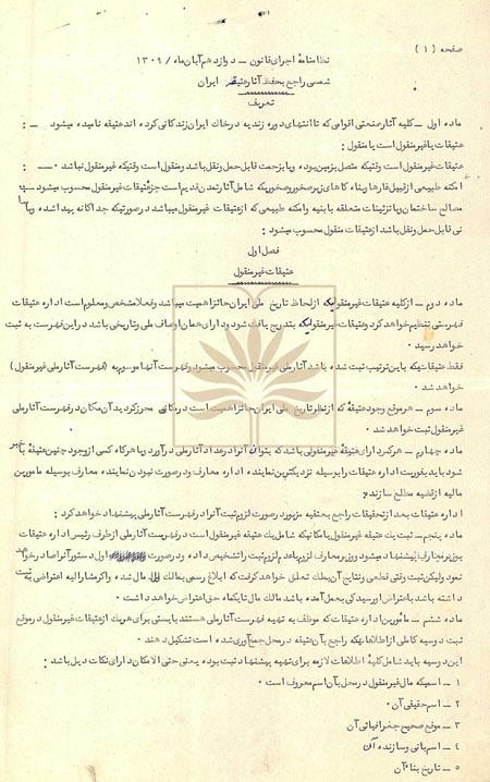 اين سند نظامنامه اجرای قانون حفظ آثار عتیقه ایران اعم از منقول و غیر منقول است که 52ماده در 4فصل عتیقات غیر منقول، عتیقات منقول، حفاری و تجارت عتیقات دارد. طبق مفاد این نظامنامه آثار صنعتی بجای مانده از اقوام تا انتهای دوره زندیه عتیقه نامیده میشود و باید توسط اداره عتیقات وزارت معارف بعنوان اثر ملی به ثبت برسد و آسیبزدن به آن ممنوع است و هر گونه تجارت آن و یا حفاری علمی برای کشف مدارک با موافقت هیئتوزراء امکانپذیر است.