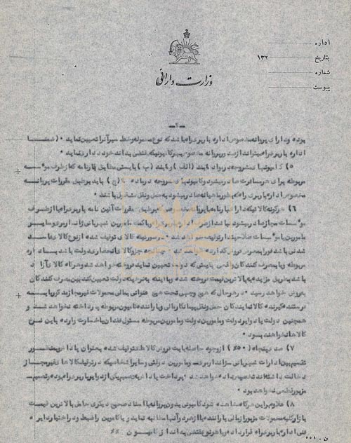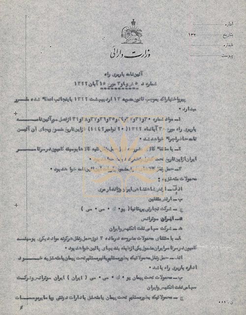 اين سند آئیننامه جدید باریری راه که توسط وزیر دارائی ابلاغ شده می باشد که در آن آمده جایگزین آئیننامه قبلی است و بموجب اختیارات قانونی واگذار شده به وی تهیه شده و طبق مفاد آن کلیه کالاهای حمل شده توسط کامیون در کشور تحت نظارت دولت انجام میشود و کالاهای ارتش ایران و متفقین، شرکت بریتانیایی یو ک سی سی، ایران سوترانس و شرکت نفت ایران و انگلیس مستثنی شده است.