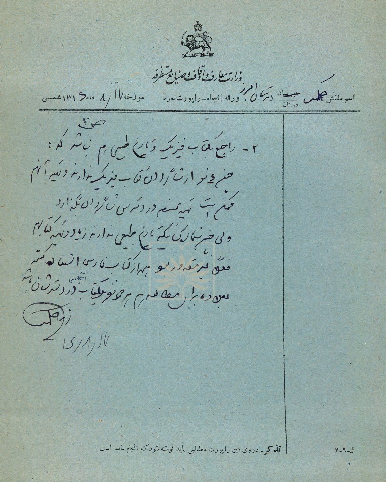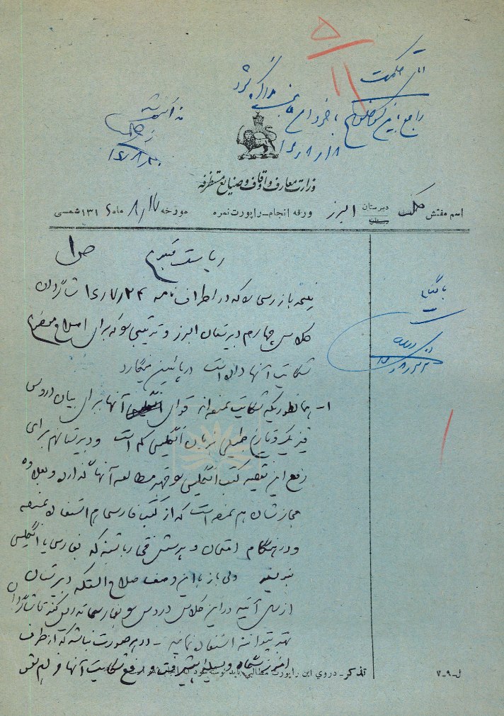 گزارش بازرس حکمت به وزارت معارف و اوقاف و صنایع مستظرفه، از نتیجه رسیدگی به شکایت شاگردان کلاس چهارم دبیرستان البرز