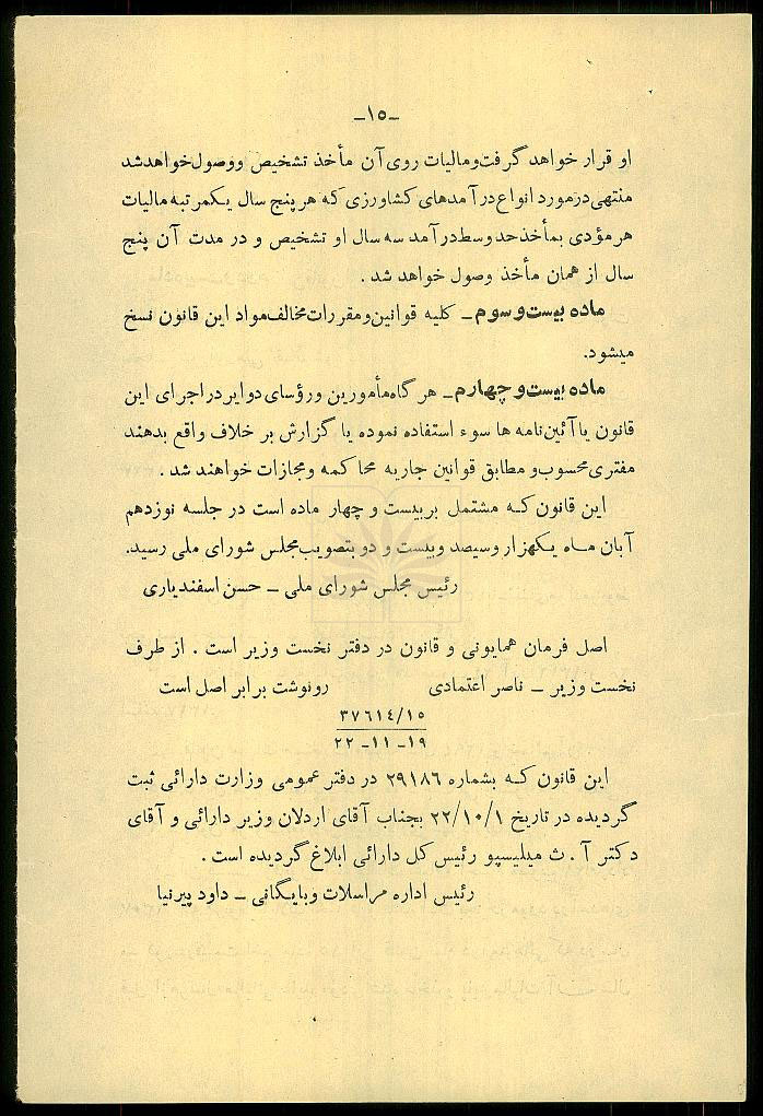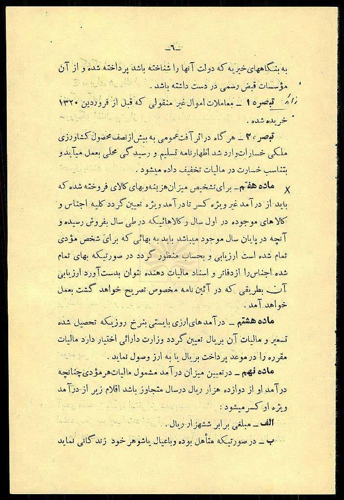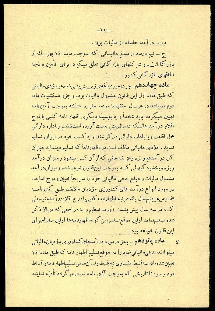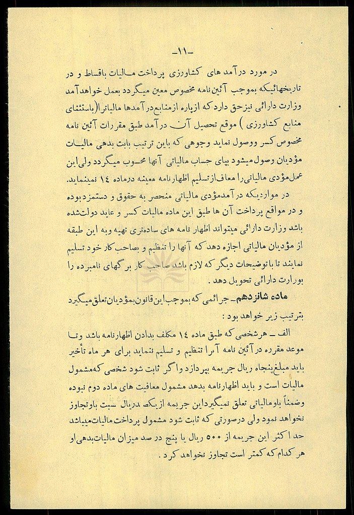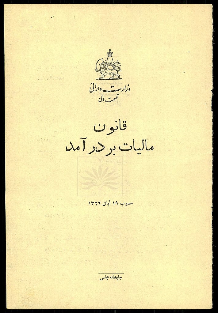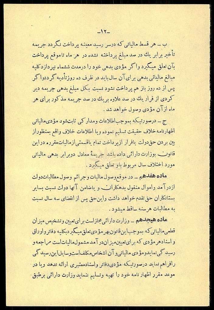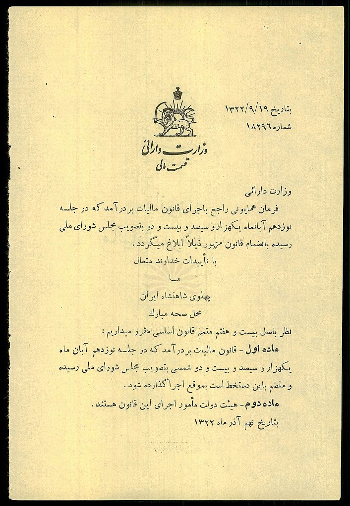 رونوشت قانون مالیات بر درآمد مصوب 19 آبان ماه 1319 ابلاغی از سوی وزارت دارائی، شامل 24 ماده و 2 تبصره در خصوص چگونگی گرفتن مالیات بر درآمد از شرکت، بنگاه و موسسه، درآمدهای ویژه و غیر ویژه، درآمدهای کشاورزی، کالاها، درآمدهای ارزی، و نیز تشریح اشخاص مستثنی از مالیات، کسور و جرائم مالیاتی، رسیدگی به شکایات مؤدیان، لزوم تصویب آییننامههای اجرایی قانون و مجازات مأموران و روسای دوایر سوء استفاده کننده از آن