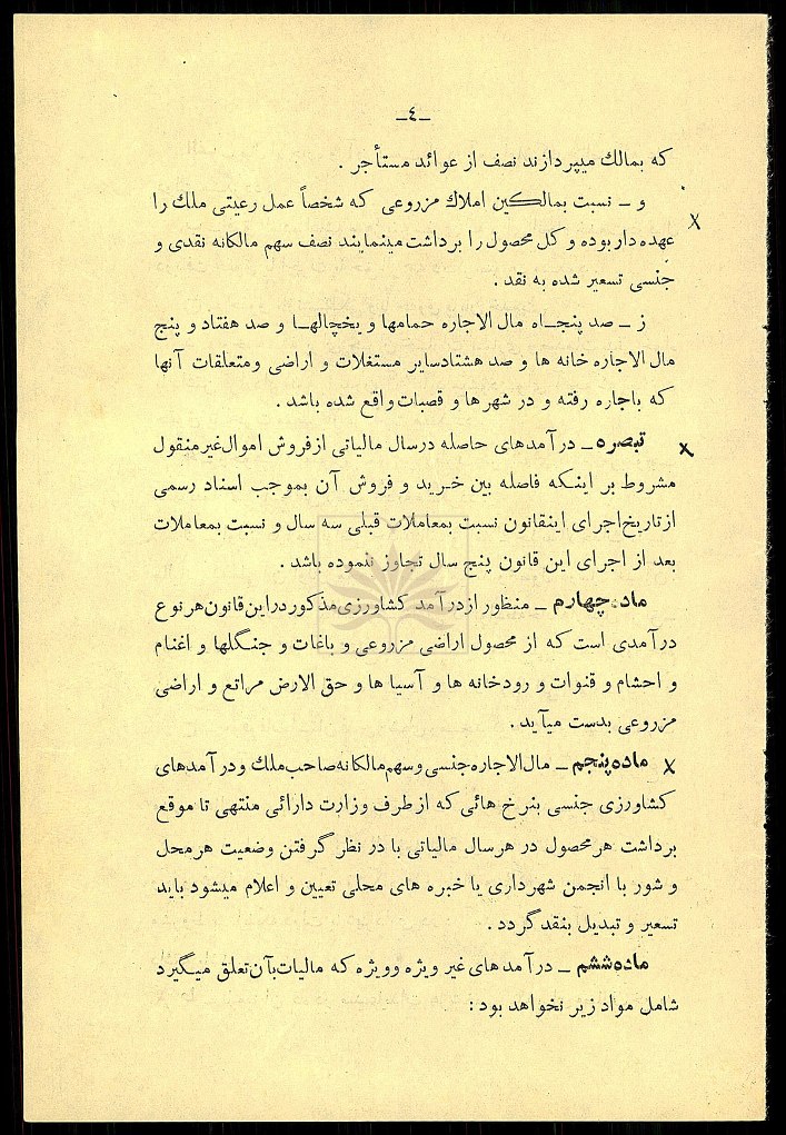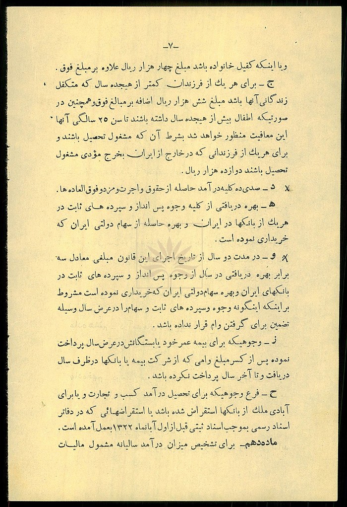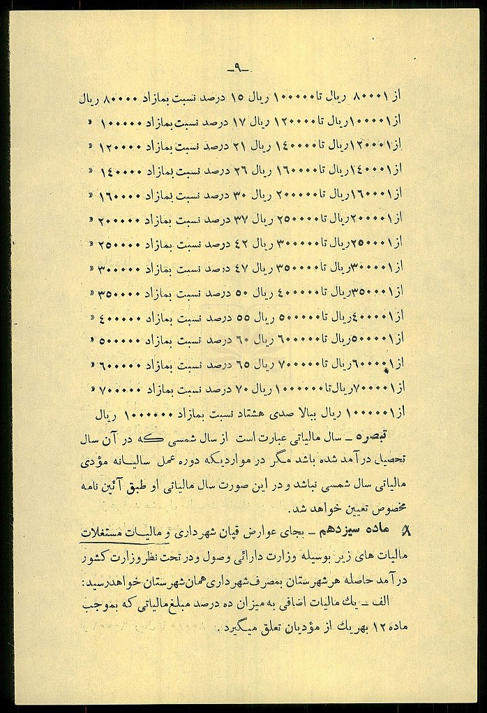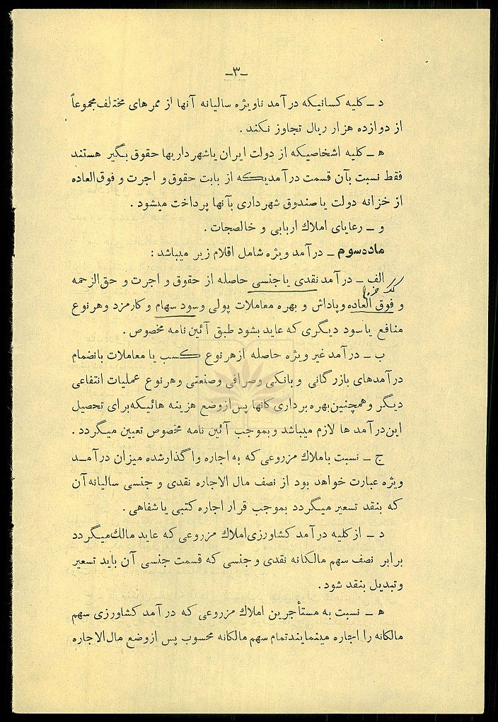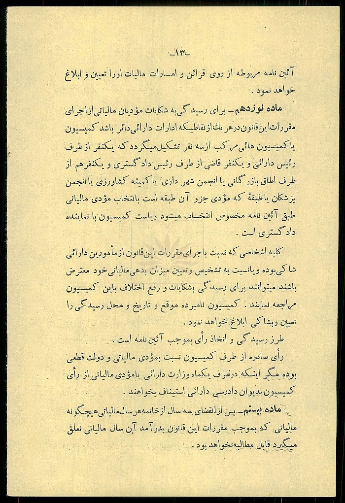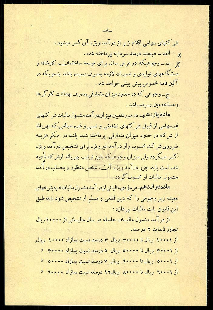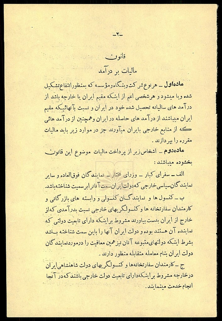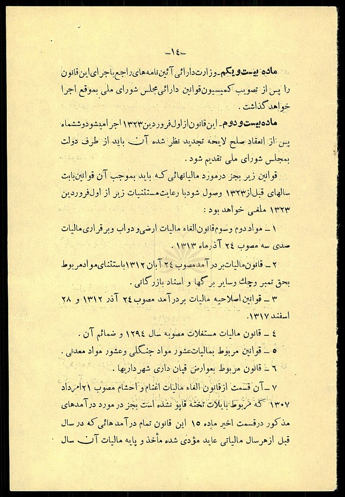 رونوشت قانون مالیات بر درآمد مصوب 19 آبان ماه 1319 ابلاغی از سوی وزارت دارائی، شامل 24 ماده و 2 تبصره در خصوص چگونگی گرفتن مالیات بر درآمد از شرکت، بنگاه و موسسه، درآمدهای ویژه و غیر ویژه، درآمدهای کشاورزی، کالاها، درآمدهای ارزی، و نیز تشریح اشخاص مستثنی از مالیات، کسور و جرائم مالیاتی، رسیدگی به شکایات مؤدیان، لزوم تصویب آییننامههای اجرایی قانون و مجازات مأموران و روسای دوایر سوء استفاده کننده از آن
