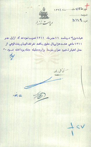 شرح سند: اين سند اعلام مصوبة هيئت وزراء است كه مطابق آن از اول مهر ماهي هشت هزار ريال حقوق يكصد تفنگچي پشتكوهي از محل اعتبار ذخيره عمران، توسط وزارت جنگ پرداخت شود.