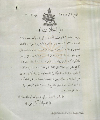 شرح سند: اين سند اعلان رئيس انحصار دولتي دخانيات كرمانشاه است كه طبق مفاد آن به زارعين اخطار داده ميشود كه كليه محصولات دخانيه بايد ظرف حداكثر سه ماه پس از برداشت محصول و خشك شدن وارد انبارهاي دولتي شود وگرنه به نفع دولت ضبط ميگردد.
