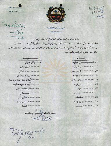 شرح سند: اين سند نامه شهرداري خدابنده به معاونت عمران استانداري زنجان است كه در آن تغيير نام يازده خيابان اين منطقه كه بعد از انقلاب صورت گرفته، اعلام شده است.