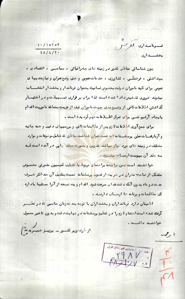 شرح سند: اين سند نامهاي از طرف وزير كشور به فرمانداريها است و اين نامه به فرمانداري تفرش ارسال شده كه در آن آمده منضم به سه جلد حاوي پرسشنامه است تا براي بدست آوردن اطلاعات مربوط به مناطق كشور در زمينههاي جغرافيايي، سياسي، اقتصادي، بهداشتي، فرهنگي، كشاورزي، خدمات عمومي عمران و نيازمنديهاي عمومي براي كلية مأموران دولت به خصوص فرمانداران و بخشداران آينده اقدام شود و فرماندارني كه بعدا انتخاب ميشوند با اطلاع بيشتري به منطقه خود بروند. در نامه از فرمانداران خواسته شده با تكميل آن به ايجاد آرشيو فني براي تمركز اطلاعات مهم كمك نمايند.