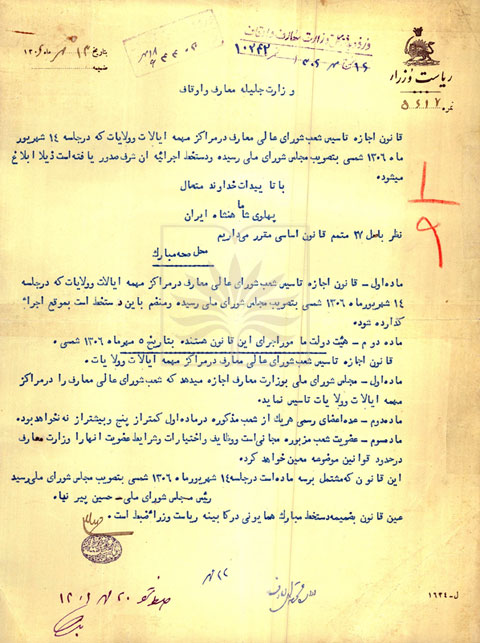 نامه رئیس الوزراء به وزارت معارف وابلاغ متن قانون تصویب شده 14شهریور1306 مجلس با تائید شاه مبنی بر اجازه تاسیس شورای عالی معارف در مراکز مهمه ایالات و ولایات.