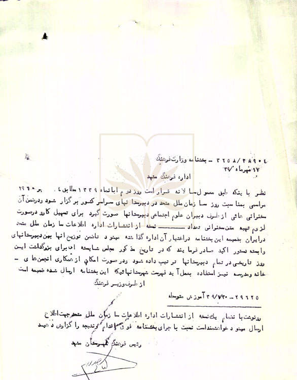 بخشنامه وزارت فرهنگ در زمینه برپایی مراسم در دبیرستانهای کشور بمناسبت روز سازمان ملل در دوم آبان ماه طبق معمول سالانه و ارسال انتشارات این سازمان برای توزیع در مدارس و تهیه سخنرانی مناسب.