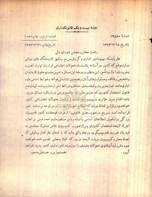 نامه نخست وزیر به رئیس مجلس در خصوص اهمیت مدیریت اداری و طبقه بندی مشاغل و شرایط احراز شغل و به طور کلی قانون استخدام کشوری و اعلام ارسال ماده واحده لایحه استخدام کشوری و درخواست تصویب آن که موجب بهبود امور اداری خواهد شد.