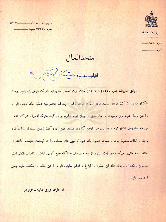 شرح سند: بخشنامة وزارت مالیه و اعلام مصوبة هیئت دولت درخصوص واگذاري، صدور پنبه به شرکت سهامی پنبه، پشم و پوست و الزام رعایا و زارعان بر اساس درخواست اين شركت به رعايت مواردي همچون، توده نكردن وش و جوزقه در بیابان و قرار دادن آنها در کیسة مخصوص، جداگانه نگهداري كردن چینهای مختلف و جداسازي پنبههای آفتدار از سالم.