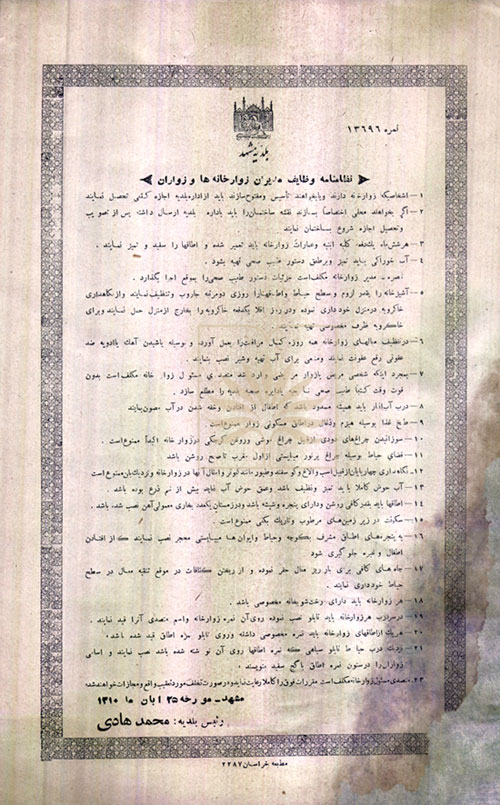 شرح سند: این نظامنامه 22 ماده دارد که از طرف بلدیة مشهد صادر شده و وظایف مدیران زوّارخانهها و زوّار را نوشته از قبیل کسب اجازه از بلدیه برای تأسیس زوارخانه، تعمیر و نظافت ششماهة ساختمان، تأمین آب بهداشتی و تهیه منبع آب، نظافت آشپزخانه، ضدعفونی روزانه سرویس بهداشتی، به اطلاع پزشک بهداشت رساندن وضعیت بیمار، مسدود بودن درب آب انبار، ممنوعیت طبخ غذا در اتاق، روشن بودن شبانه فضای حیاط، ممنوعیت سکونت در زمین مرطوب، دارای پنجره و نور بودن اتاقها در روز، نصب بخاری، نصب حفاظ برای پنجره و ایوان، حفر چاه برای بارریز توالت در موقع تنقیه سال، نصب رختشویخانه، نصب تابلوی اعلان مشخصات متصدی زوارخانه و شماره اتاقها و اسامی زوّار و غيره... .