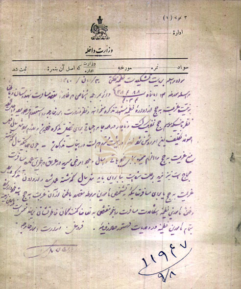 شرح سند: نامة وزارت امور خارجه به ریاست تشکیلات نظمیه مملکتی، در خصوص ممنوعیت صدور تذکره حج همچون سال گذشته پس از مشورت با هیئت دولت به دلیل وجود بیماری مسری در عراق که مسیر عمدة مسافرت حجاج است.