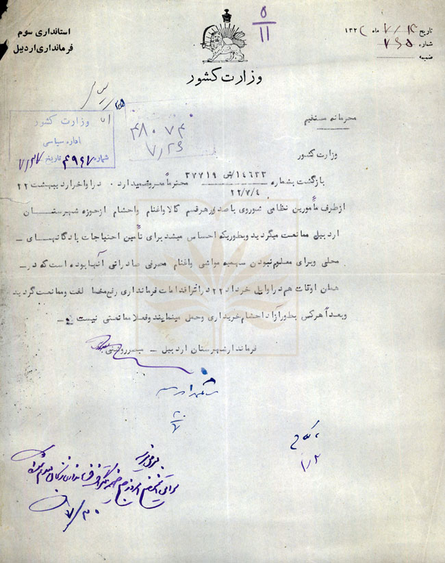 اين سند، حاوی يكي از مكاتبههای صورت گرفته بين فرمانداری شهرستان اردبيل و وزارت كشور است كه در رده محرمانه مستقيم قرار داشته است. در اين نوشته، فرماندار اردبيل با اشاره به برخي از محدوديتهای اعمال شده مأموران نظامی شوروی برای صدور هر نوع كالا، اغنام و احشام از حوزه آن شهرستان اعلام كرده كه با اقدامهای خود، محدوديتها برطرف، و خريد و حمل احشام آزاد شده است. فرمانداری اردبيل دليل ممانعت مأموران شوروی را سياست آنان برای تأمين احتياج پادگانهای محلی و معلوم نبودن سهميه مواشی و اغنام صادراتی آنها اعلام نموده است.