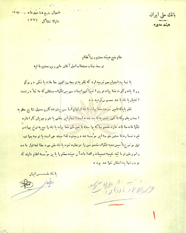 درخواست تأسيس شعبه تلگراف مخصوص در ساختمان بانك ملی