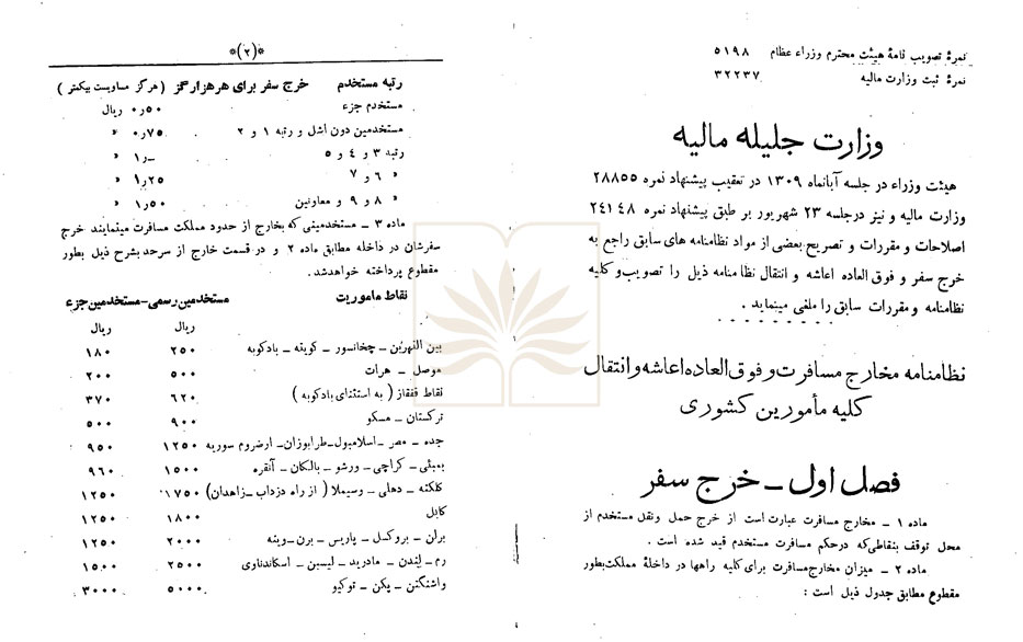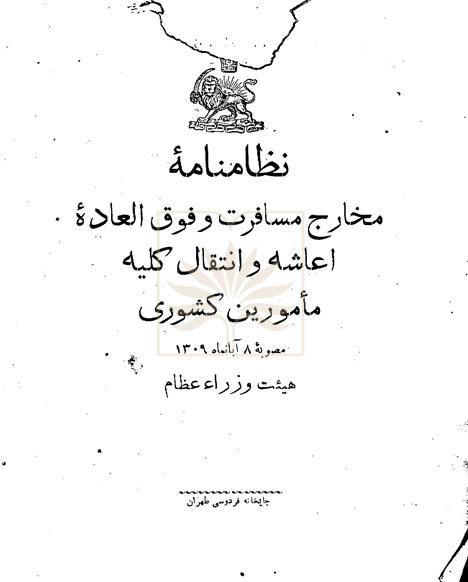 - عنوان سند : نظام نامه مخارج مسافرت و فوقالعاده اعاشه(معاش) و انتقال كليه مأموران كشوری