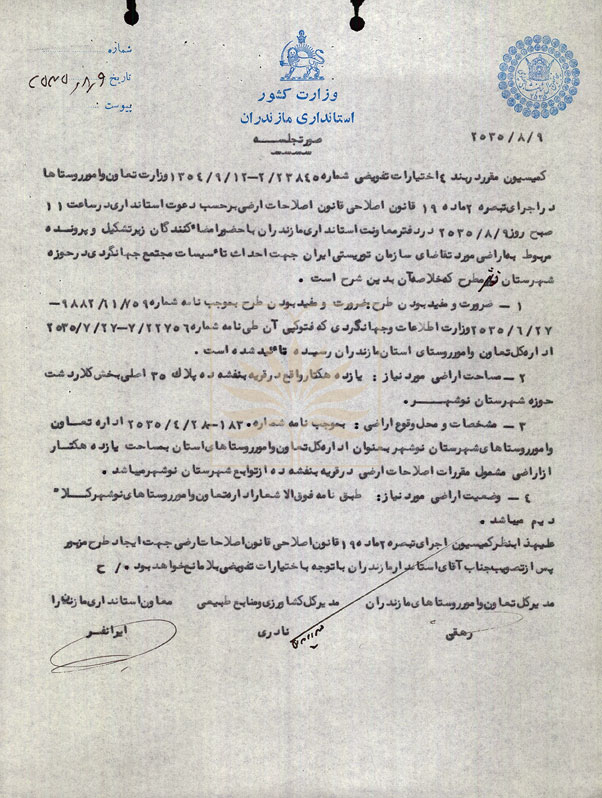 اين سند، صورت جلسه تشكيل شده در دفتر معاونت استانداری مازندران در خصوص درخواست اراضی مورد نظر سازمان توريستی ايران برای احداث تأسيسات مجتمع جهانگردی در شهرستان نوشهر است. براساس متن صورت جلسه، ضرورت و مفيد بودن طرح به تأييد اداره كل تعاون و امور روستای استان مازندران رسيده و يازده هكتار از اراضی ديم روستای بنفشه در بخش كلاردشت شهرستان نوشهر به اين امر اختصاص داده شده است. در پايان نيز قيد شده كه اجرای طرح پس از تصويب استاندار مازندران بلا مانع می باشد.