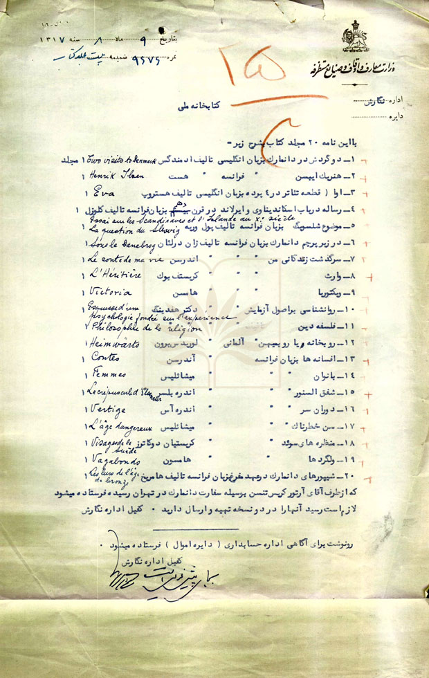 در اين سند، كفيل اداره نگارش وزارت معارف و اوقاف و صنايع مستظرفه، اسامي كتاب های ارسالی آرتور كريس تنسن به كتابخانه ملي را اعلام كرده است. كتاب ها به وسيله سفارت دانمارك به تهران رسيده و از كتابخانه ملی درخواست شده رسيد آن ها را به وزارتخانه ارسال نمايد.