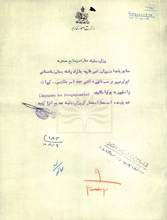 در اين سند، وزارت امور خارجه به وزارت معارف و صنايع مستظرفه، اعلام كرده است كه بر اساس قانون 3 اكتبر 1929م. نام كشور صرب، كروات و اسلوون به يوگواسلاوی[يوگسلاوی] تبديل شده است. اين اعلام بر مبنای يادداشت وصولی سفارت ايران در رم از وزارت امور خارجه بلگراد صورت گرفته است.