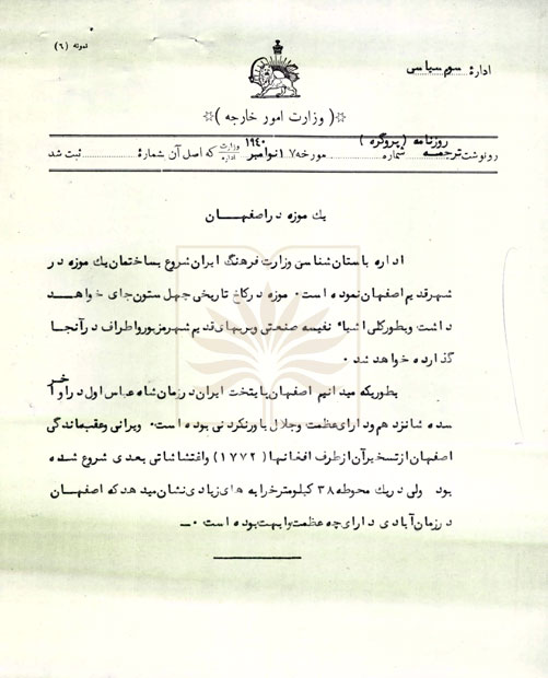 در اين سند، وزارت امور خارجه ترجمه روزنامه «پروگره» در خصوص تأسيس موزه در اصفهان را منتشر كرده است. بر اساس متن خبر روزنامه، اداره باستان شناسی وزارت فرهنگ ايران آن موزه را در محل كاخ چهل ستون اصفهان و برای نمايش آثار نفيس صنعتی و قديم شهر اختصاص داده است. در ادامه خبر، تاريخچه ای از دوران آبادانی اصفهان در زمان شاه عباس و ويرانی شهر بعد از حضور افغان ها ارائه شده است.
