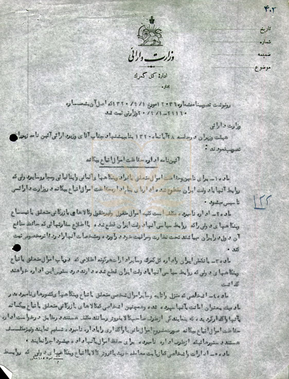 - عنوان سند : آئيننامه اداره حفاظت اموال اتباع بيگانه، مصوب هيئت وزيران