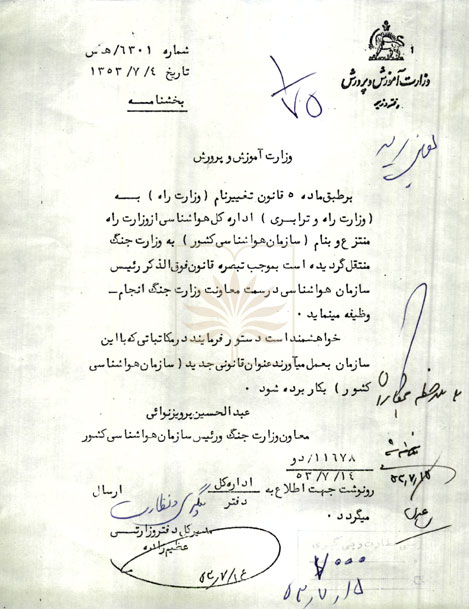 بخشنامه وزارت آموزش و پرورش مبنی بر انتقال ادارهكل هواشناسی كشور به وزارت جنگ با عنوان سازمان هواشناسی كشور، بر اساس ماده 5 قانون تغييرنام وزارت راه به وزارت راه و ترابری و لزوم استفاده از عنوان جديد در مكاتبات اداری.