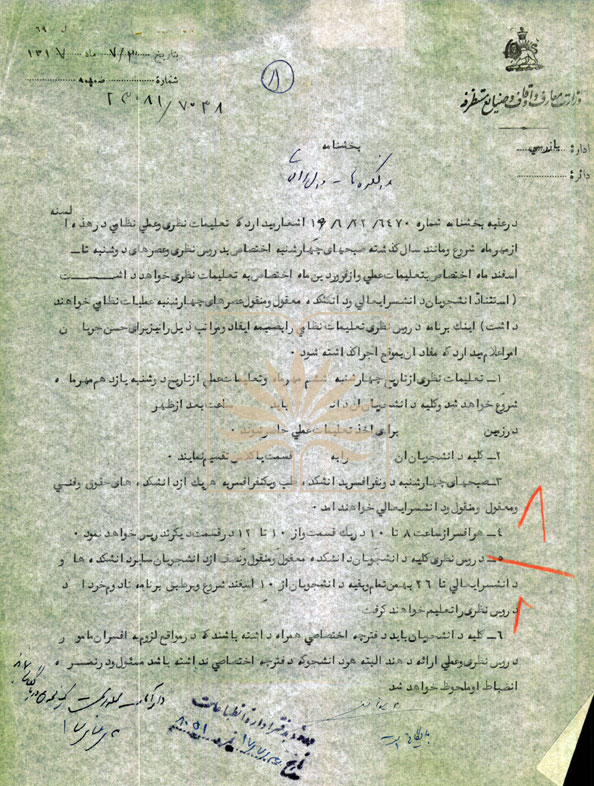 - عنوان سند : بخشنامة وزارت معارف و اوقاف و صنايع مستظرفه، در خصوص شروع دورههاي تعليمات نظري و عملي نظامي از مهرماه