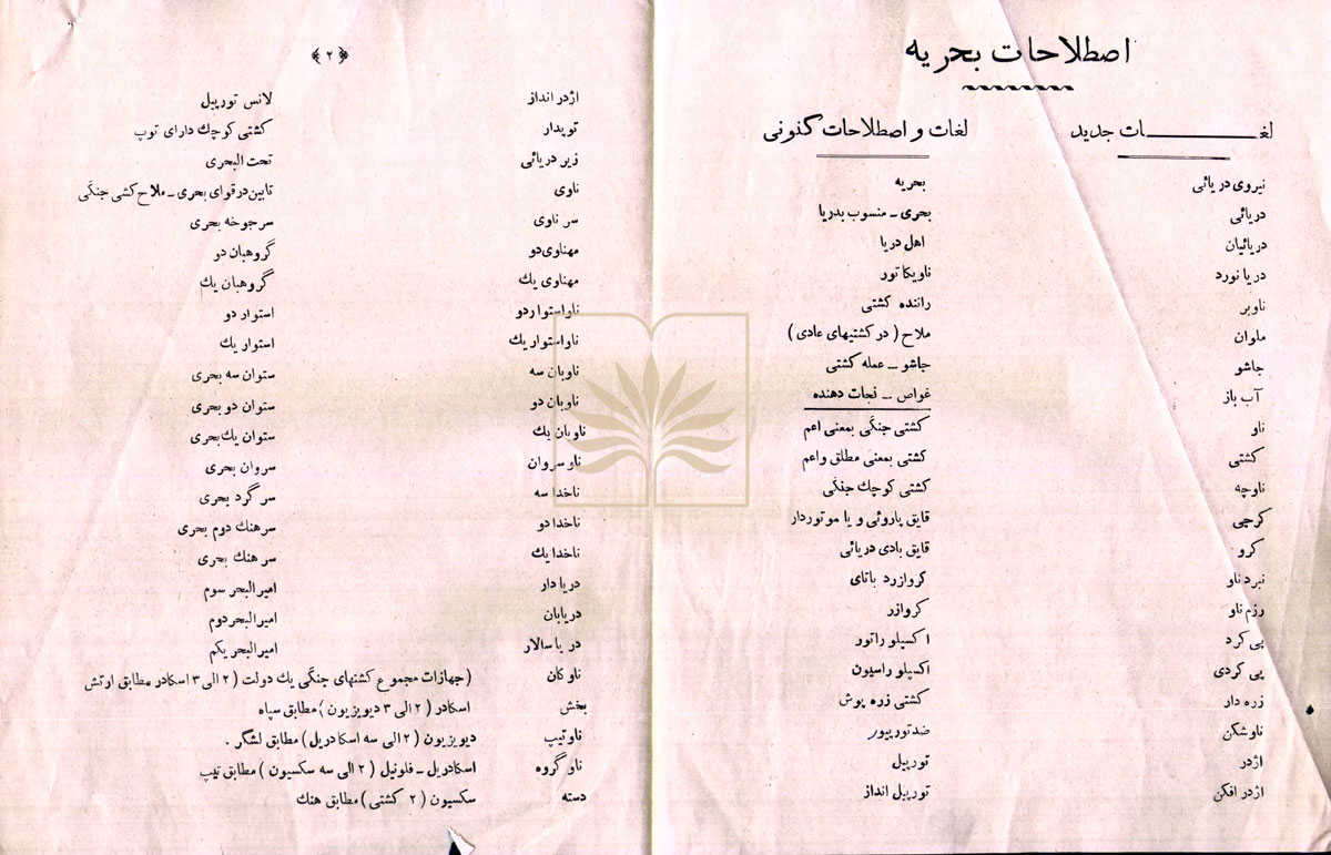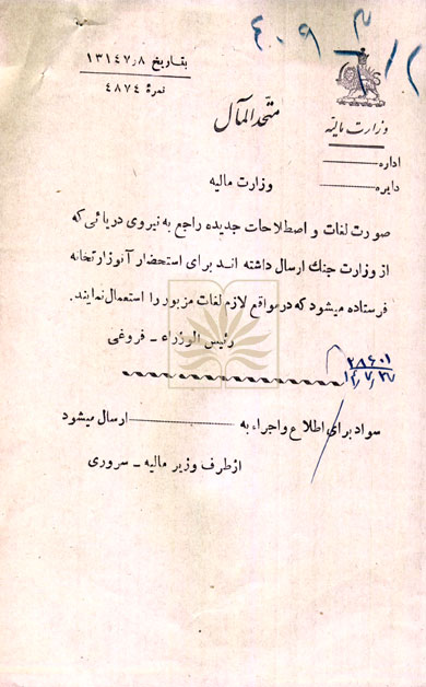 - عنوان سند : بخشنامۀ اعلام اصطلاحات بحريه(نيروي دريائي) به وزارت مالیه