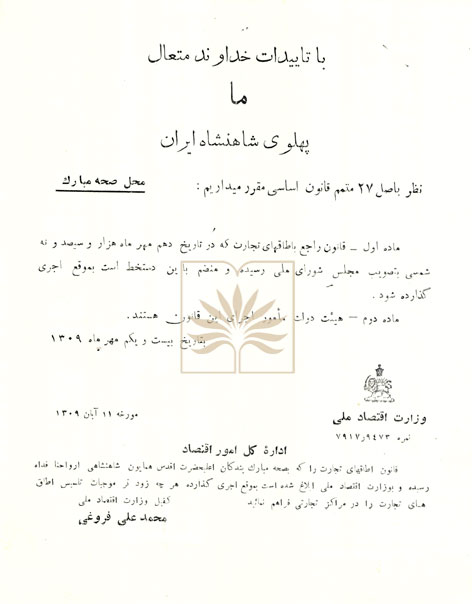 شرح سند: در این فرمان دومادهای، قانون تأسیس اتاقهای تجارت ابلاغ شده است. قانون مزبور، در دهم مهرماه 1309 به تصویب مجلس شورای ملی رسیده بود. بر اساس مادۀ دوم، هیئت دولت مأمور اجرای این قانون شده است. در ذیل فرمان محمدعلی فروغی به ادارهکل اقتصاد وزارت اقتصاد ملی آمده است که هر چه زودتر امکانات تأسیس اتاقهای تجارت در مراکز تجارتی فراهم گردد.