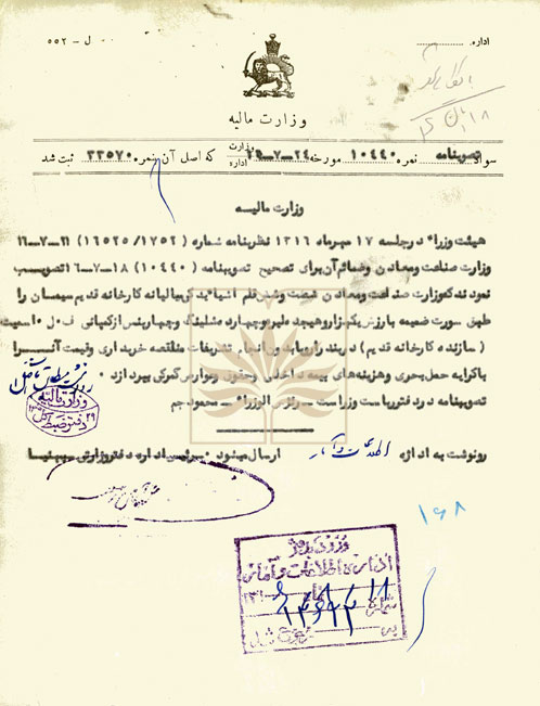 - عنوان سند : تصویبنامۀ هیئت وزیران، در بارۀ خرید اشیای یدکی کارخانۀ قدیم سیمان