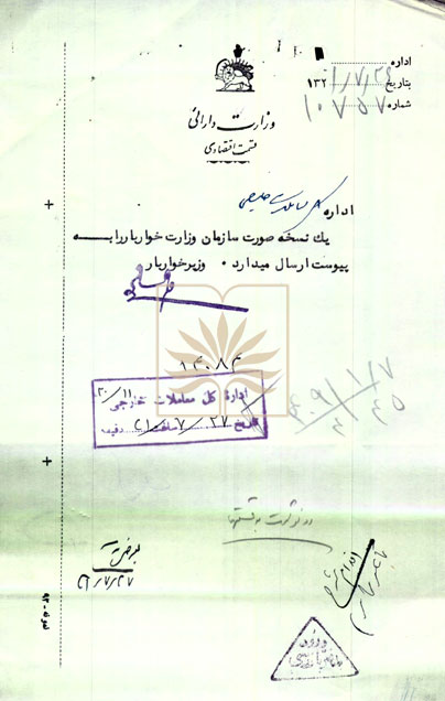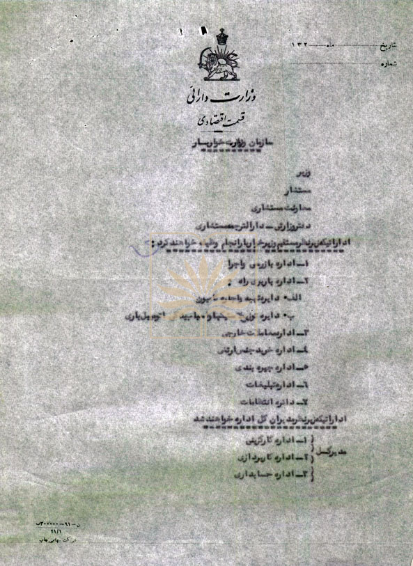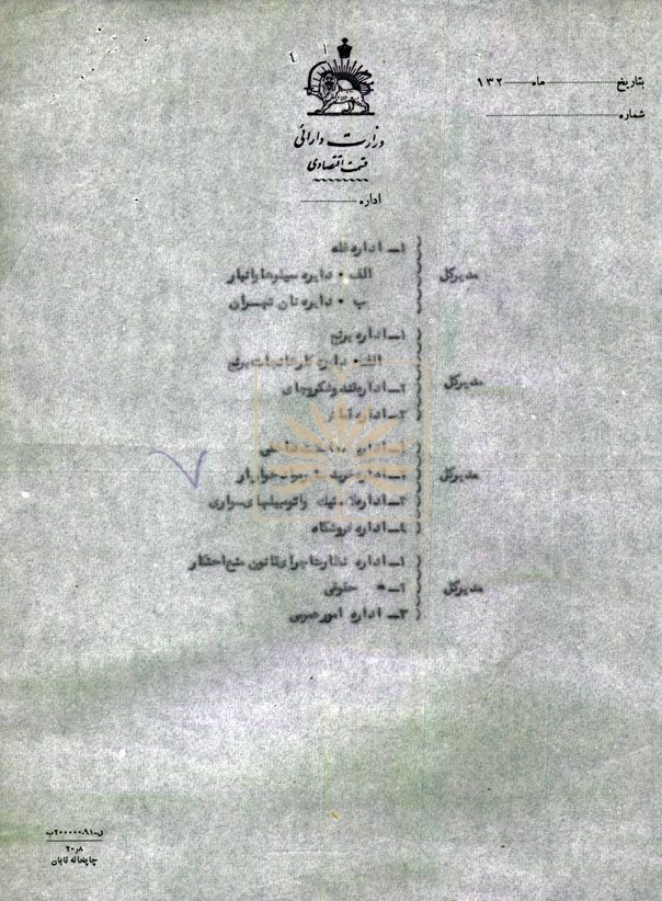 شرح سند: در این سند، وزیر خواربار، صورت تشکیلات سازمان خواربار را به ادارهکل معاملات خارجی وزارت دارائی ارسال کرده است. بر طبق این فهرست، سازمان یاد شده شامل وزیر، مستشار، معاونت مستشار و دفتر وزارتی- دارالترجمۀ مستشاری است و 6 اداره همراه با دایرۀ انتظامات، زیر نظر مستتقیم وزیر خواربار انجام وظیفه خواهند کرد. در ادامه، به ادارههائی که زیر نظر مدیران کل خواهند بود، اشاره شده است.