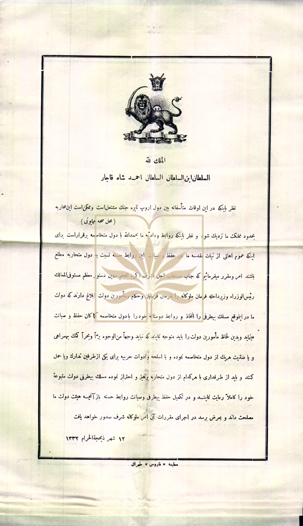شرح سند: احمدشاه قاجار، در این فرمان با اشاره به نزدیکی جنگ دولتهای اروپائی به مرزهای ایران و ارتباط ایران با آن کشورها، سیاست بیطرفی ایران را در جنگ جهانی اول اعلام کرده است. او همچنین، از مستوفیالممالک(رئیسالوزرا) و وزیر داخله درخواست کرده تا این فرمان را به فرمانفرمایان، حاکمان و مأموران دولت ابلاغ کند تا آنان از هرگونه همراهی و یا ضدیت با دولتهای متخاصم پرهیز کنند.