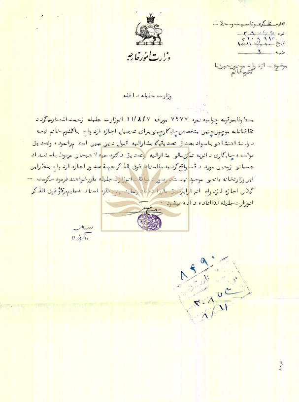 - عنوان سند : تقاضای وزارت امور خارجه از وزارت داخله، برای موافقت با ازدواج موچون چنین(متخصص چایکار چینی) با شهروند ایرانی