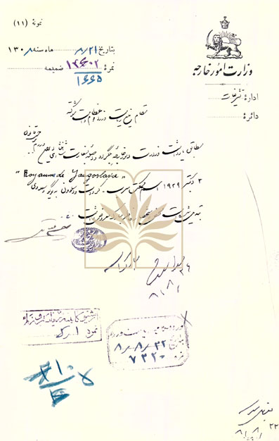 شرح سند: در این سند، وزارت امور خارجه به رئيس وزرا اعلام کرده است که مطابق یادداشت ارسالی وزارت امور خارجۀ بلگراد به سفارت ایران در رم، نام سه کشور صرب، کروات و اسلوون، بر اساس قانون 2م اكتبر 1929م. به یوگسلاوی تبدیل شده است.