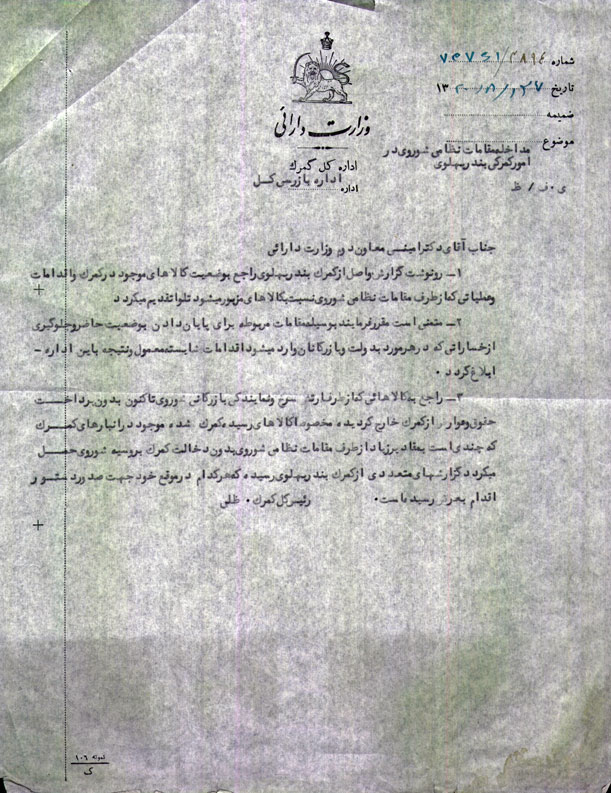 شرح سند: رئیس کل گمرک در نامۀ سهبندی خود به دکتر امینی(معاوندوم وزارت دارائی)، گزارشی از وضعیت کالاهای گمرک بندر پهلوی(انزلی) ارائه کرده است. در بند اول و آخرآن، به مداخلۀ مقامات نظامی شوروی در موضوع کالاهای موجود در گمرک بندر یاد شده و حمل کالا به شوروی بدون پرداخت عوارض اشاره شده است. در بند دوم، از دولت درخواست شده اقدامهاي شایسته برای جلوگیری از خسارتهای وارده به بازگانان ایرانی به عمل آید.
