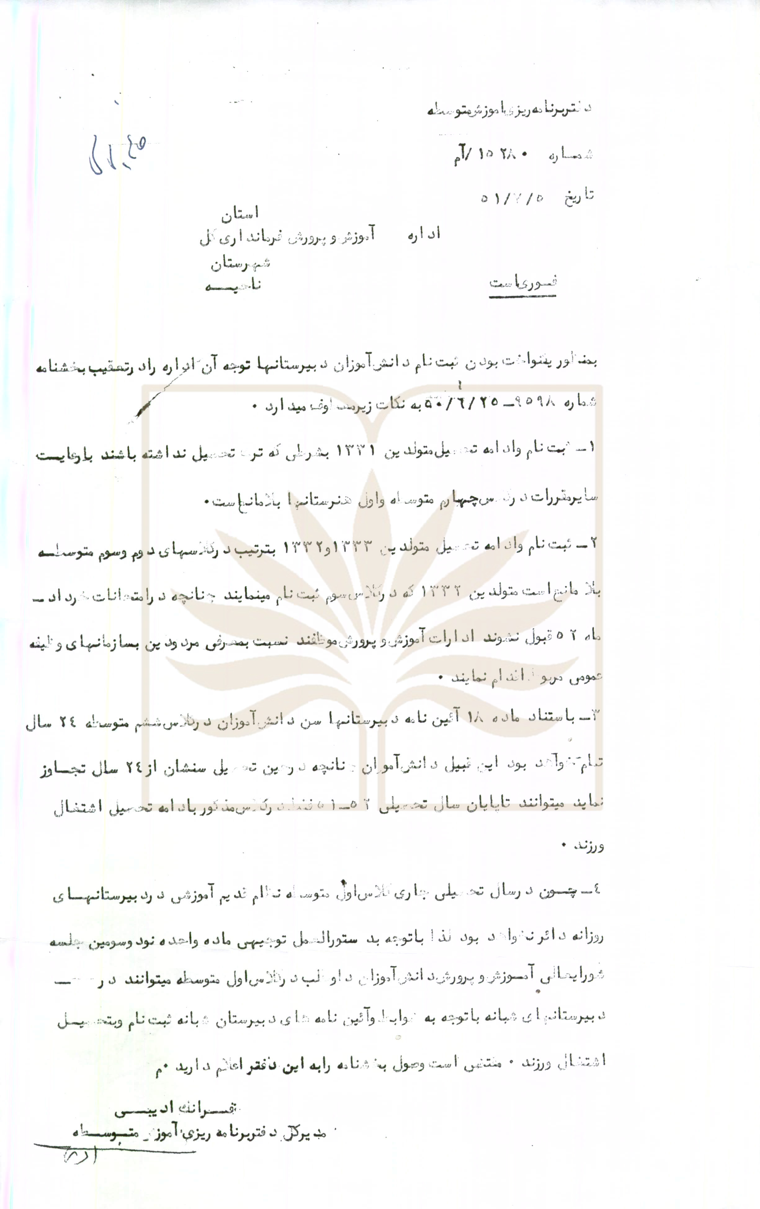 در اين بخشنامه، با اشاره به برگزار نشدن كلاس اول نظام قديم آموزشی، شرايط سنی براي ثبت نام دانش آموزان اعلام شده است. طبق اين بخشنامه، حداكثر سن دانش آموزان مقطع متوسطه، 24سال بوده است. همچنين در آن، اعلام شده است كه اگر متولدان 1332 و 133ش. در امتحان خردادماه قبول نشوند، بايد به سازمان نظام وظيفه معرفی شوند.