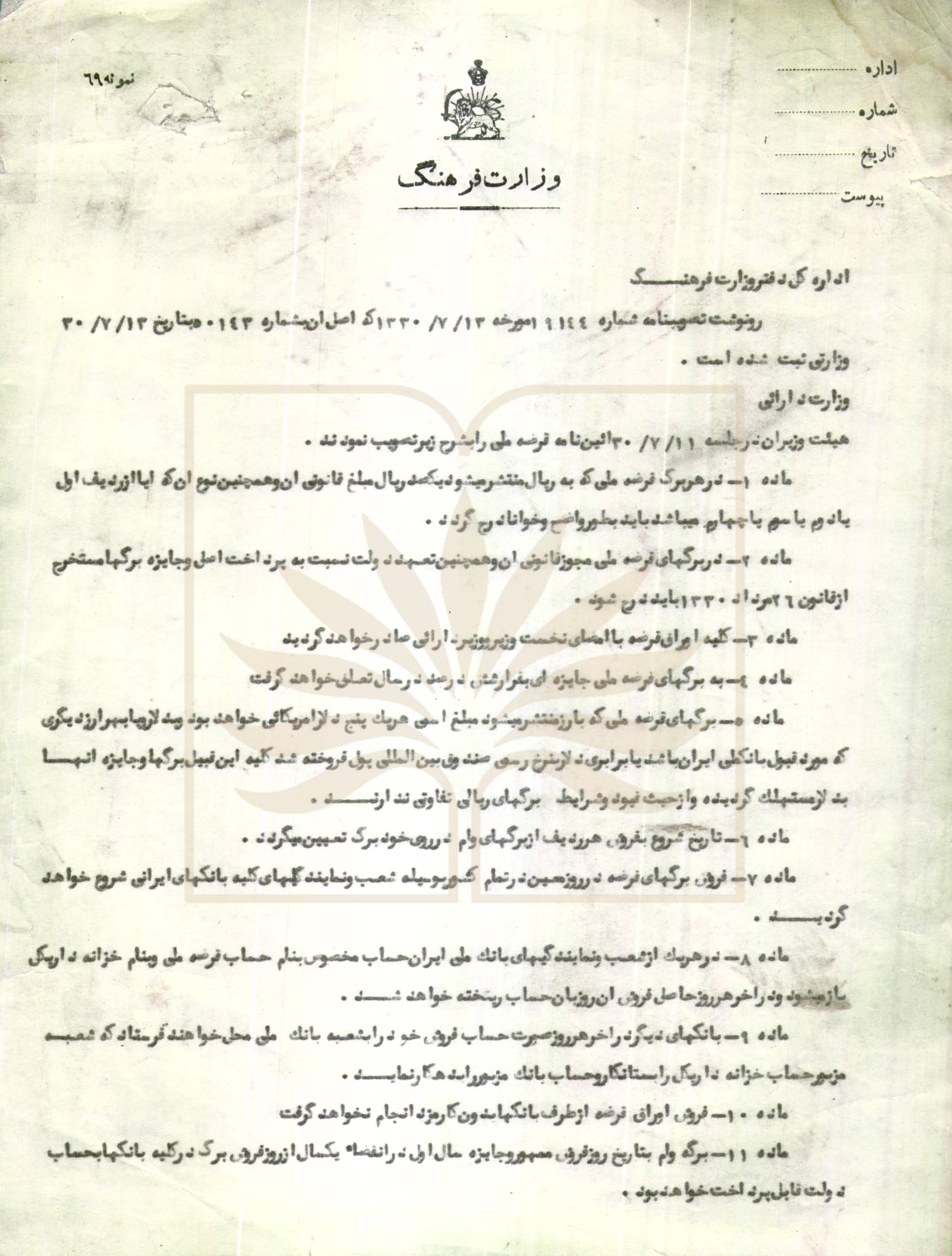 سند، حاوی آئيـن نامه ی مصوب هئيت وزيران، در باره ی قرضه ی ملی است. اين آئيننامه، در ده فصل تنظيم شده است، و عمده ترين مواد آن، عبارتاند از: الزامی بودن بيان ارزش ريالی هر برگ و نوع آن در برگ های اوراق قرضه؛ درج مجوز قانونی و تعهد دولت در پرداخت اصل و جايزه ی برگ ها؛ امضای نخست وزير بر اوراق؛ تعلق جايزه ی شش درصدی سالانه به آنها؛ فروش همزمان اوراق در يك روز در كليه ی شعبه ها و نمايندگی بانك ها و فروش بدون كارمزد اوراق.