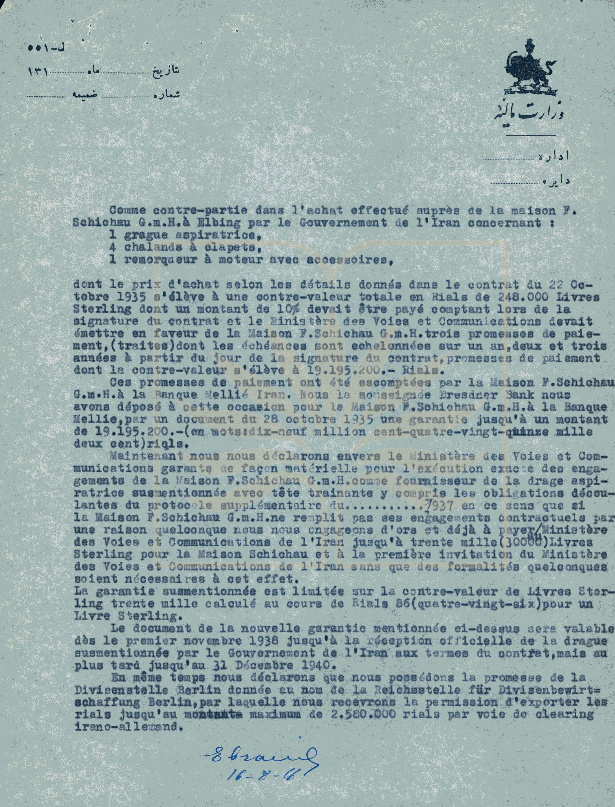 در این تصویب نامه، هیئت وزیران موافقت خـود را با پیشنهاد وزارت طرق(راه) در باره ی انجام عملیات سوار کردن کشتی شنکس، خریداری شده از کمپانی شیخائو، اعلام کرده است. بر این اساس، هزینه های ارزی و ریالی این عملیات، از محل اعتبار بودجهی بندر پهلوی(انزلی) پرداخت می شدهاست. صورتمجلس ضمیمهی این تصویب نامه، موافقت نامهی امضا شده و تعهدات طرفین قرارداد را در اين خصوص، نشان می دهد.