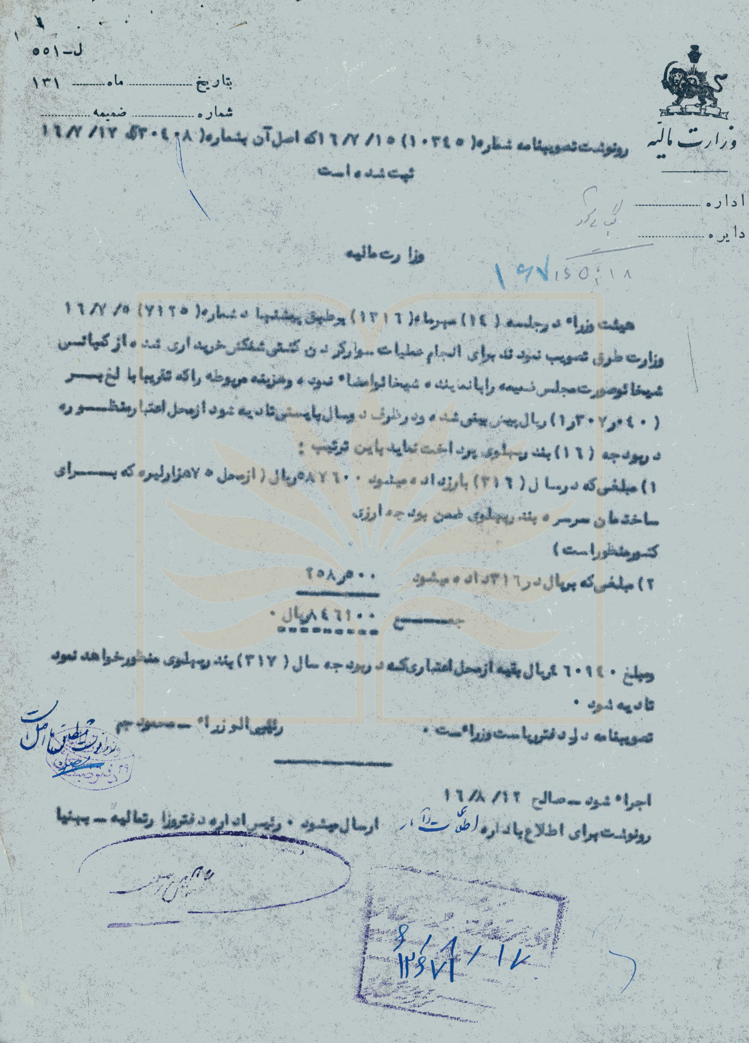 مصوبه ی هیئت وزیران، برای انجام عملیات سوار کردن کشتی «شنکس» در بندر پهلوی(انزلی)