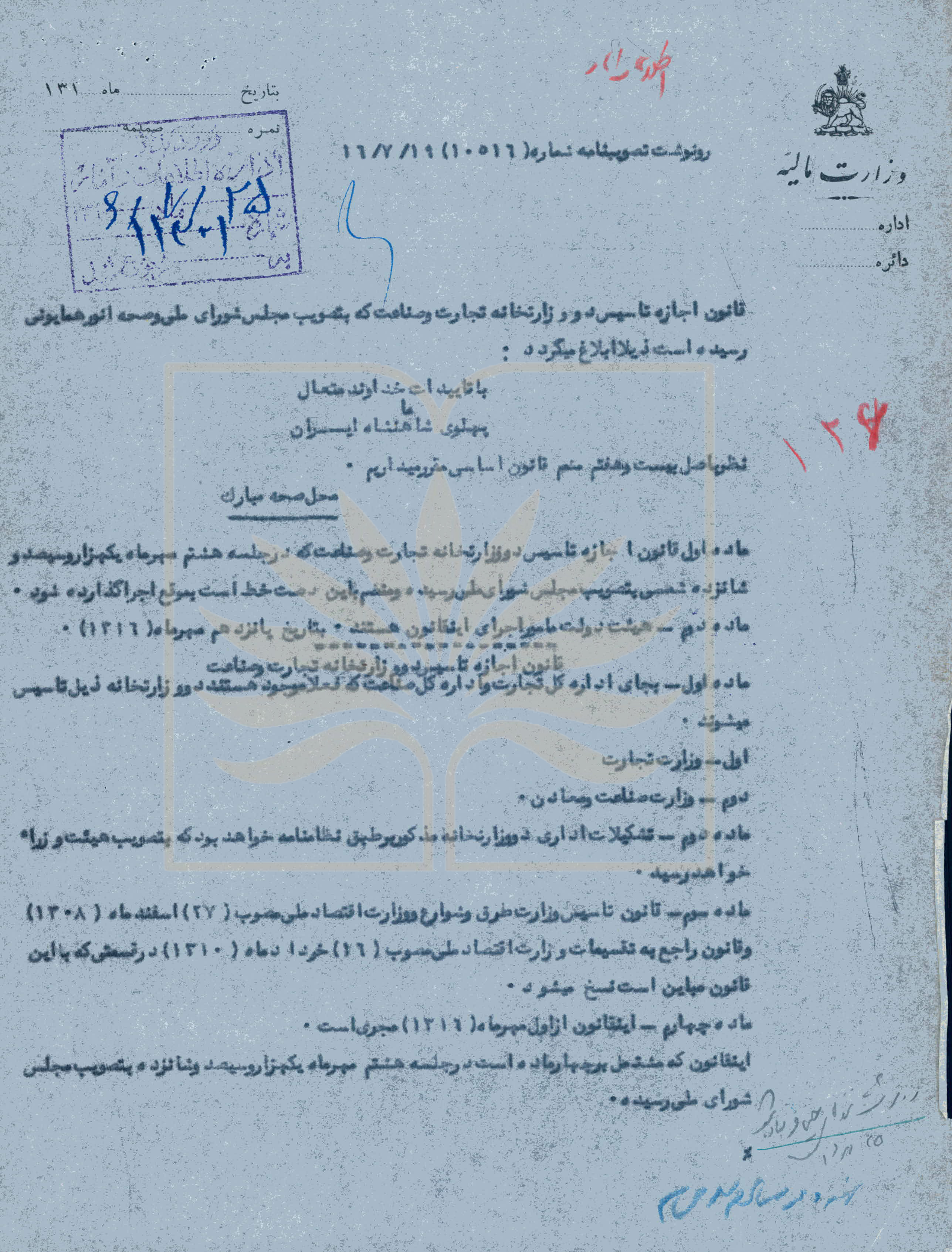 - عنوان سند : ابلاغ فرمان اجرای قانون تأسیس دو وزارت¬خانه ی تجارت و صناعت، همراه با متن قانون