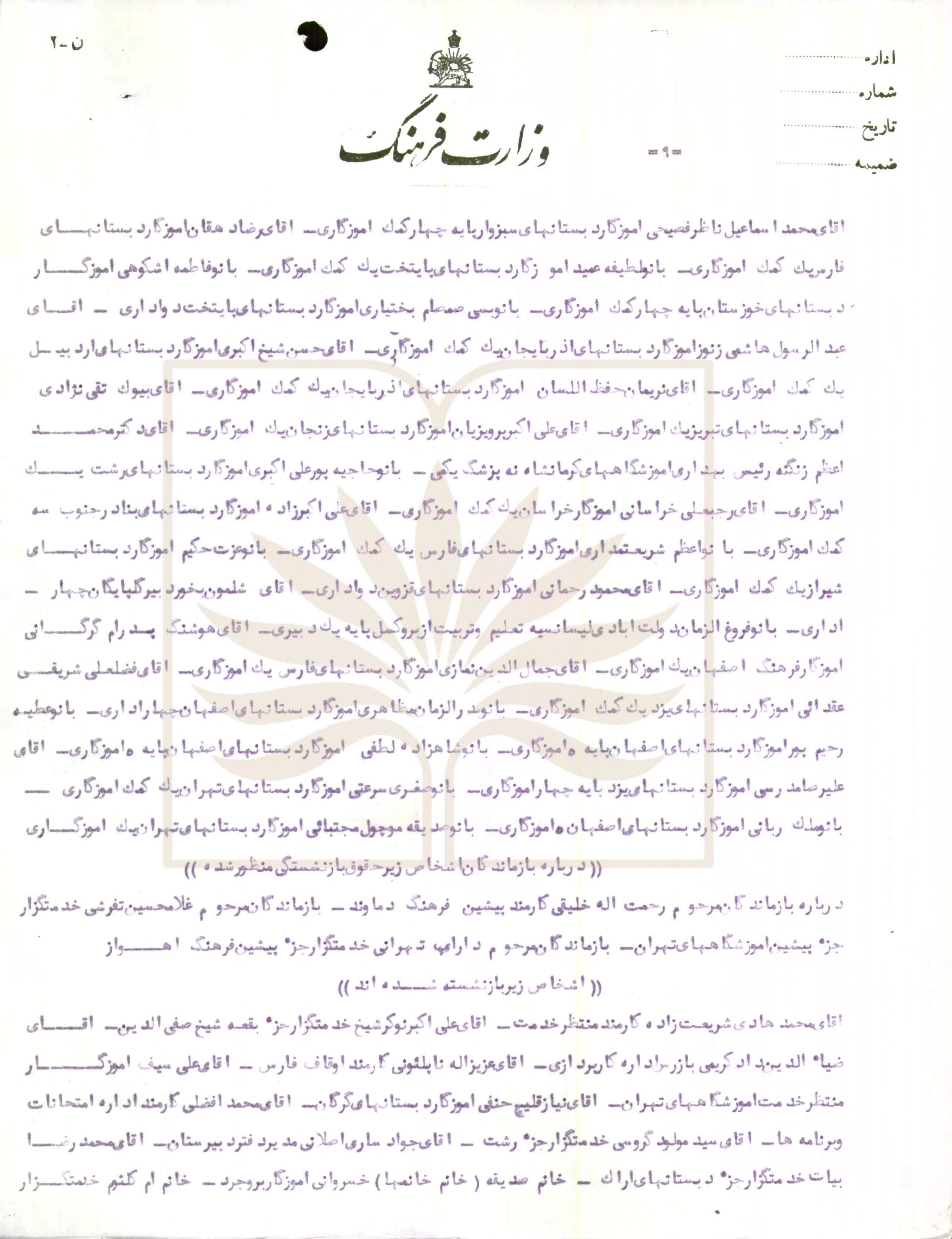 در اين سند، وزارت فرهنگ طی يك بخشنامه، عمده ترين رخدادهای آن وزارتخانه و ادارت تابعه را در شهريورماه ذكر كرده است. اين رخ دادها شامل: انتصاب، ترفيع، بازنشستگی، مأموريت و كاركرد كاركنان بوده است.